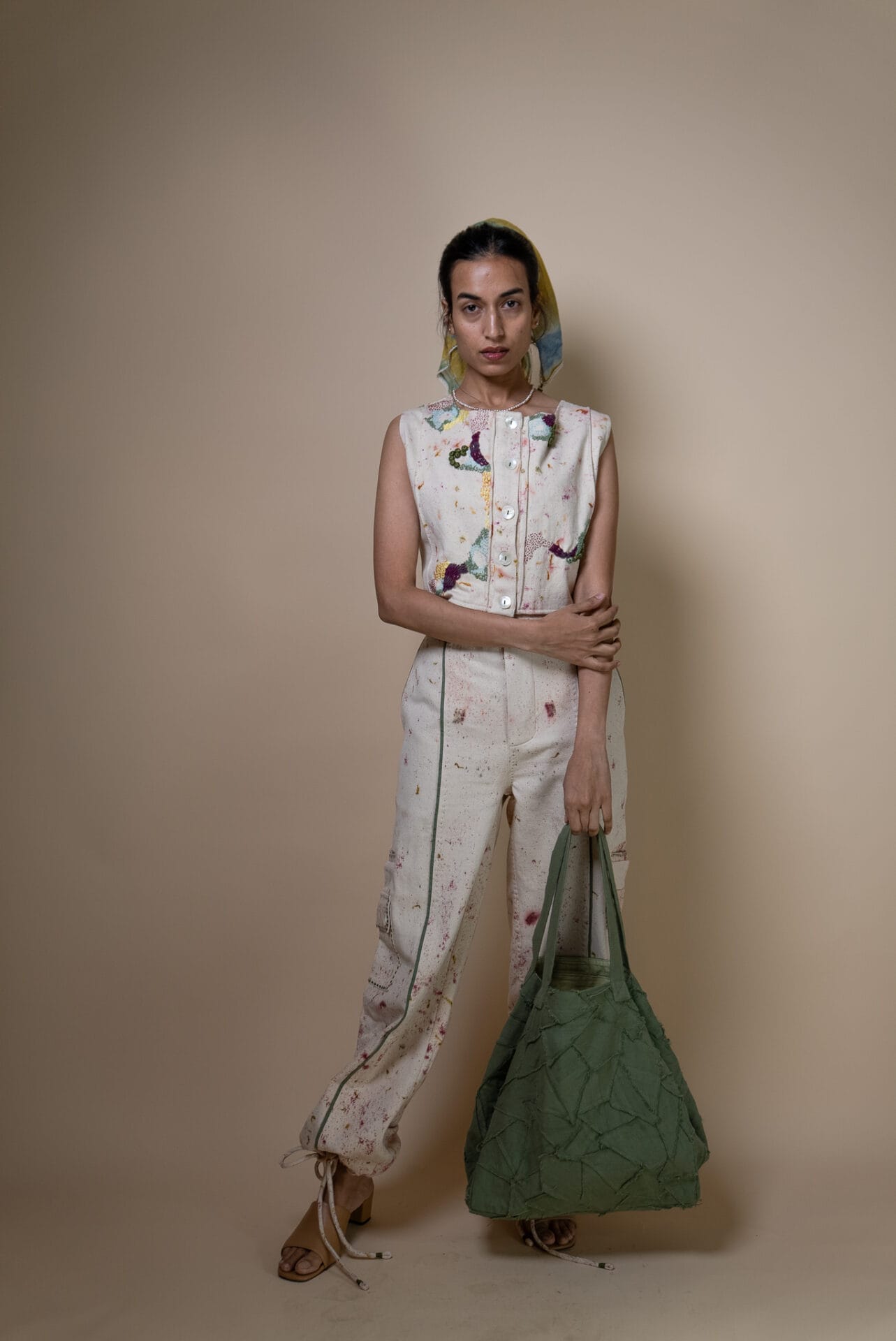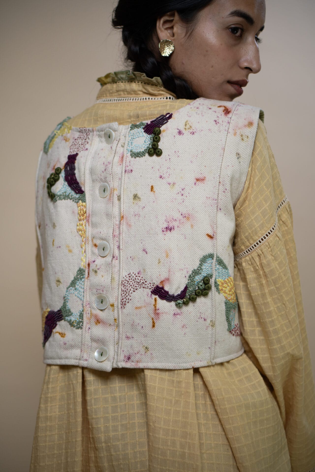 This sleeveless blouse offers versatility of use with a boat neck and button closure on one side, and a deep U-neck on the other, finished with delicate cording along both front and back. Intricate embroidery, featuring wooden bead embellishments, French knots, bullion knots, lazy daisy stitches, and traditional Kantha work, flows organically from the neckline and cascades downward. Inspired by the natural spread of moss, each blouse carries a unique, handcrafted essence.