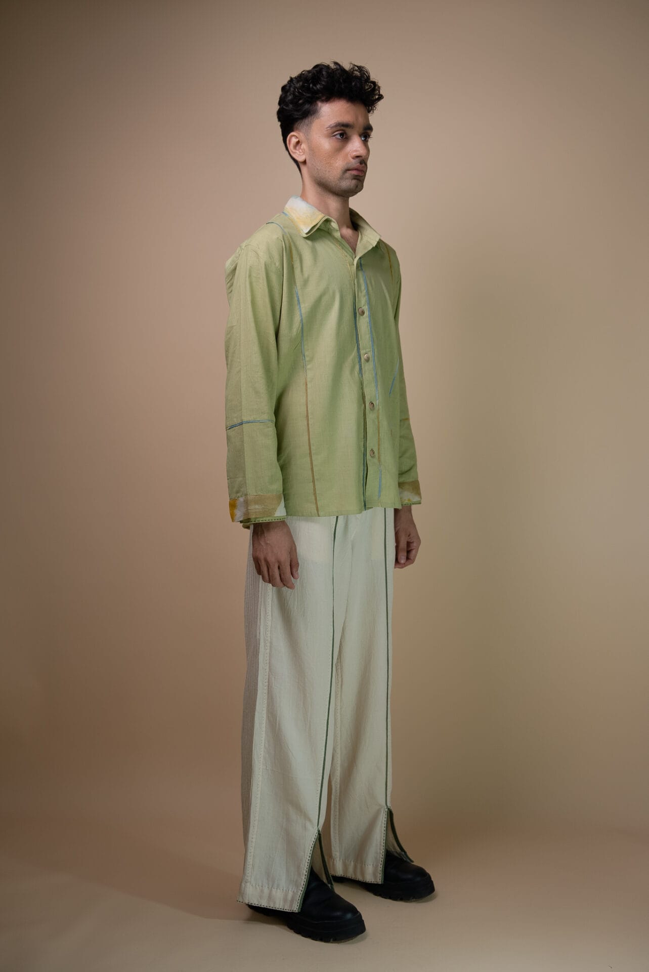 Designed in a relaxed-fit silhouette, it features a layered shirt collar accented with hand-painted Mulmul. Matching details on the cuffs and delicate mulmul piping along with Kantha lines bring an elegant finish to this thoughtfully crafted shirt.