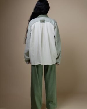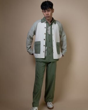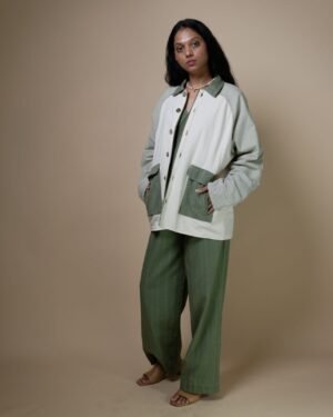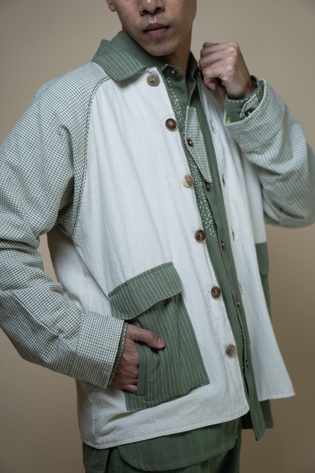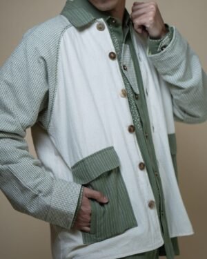 The Meadows Unisex Colour-Blocked Shirt Jacket is expertly crafted from a blend of three variations of our signature Kala Cotton- Undyed, Checkered and Solid Olive in colour using Azo-free dyes.