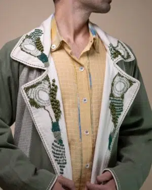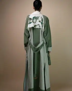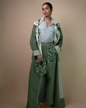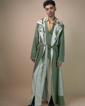 Featuring raglan sleeves and a wide lapel, the trench is accented with Kantha lines and contrasting olive piping along the lapel and front placket. This long trench is designed with high side slits, foldable cuffs, and patch pockets for added detail. Tonal embroidery incorporating French knots, bullion knots, lazy daisy stitches, and traditional Kantha work across the fabric, create an organic flow reminiscent of moss found growing along shaded forest floors, capturing the soft, uneven textures and deep, earthy greens that evoke a sense of natural tranquility.