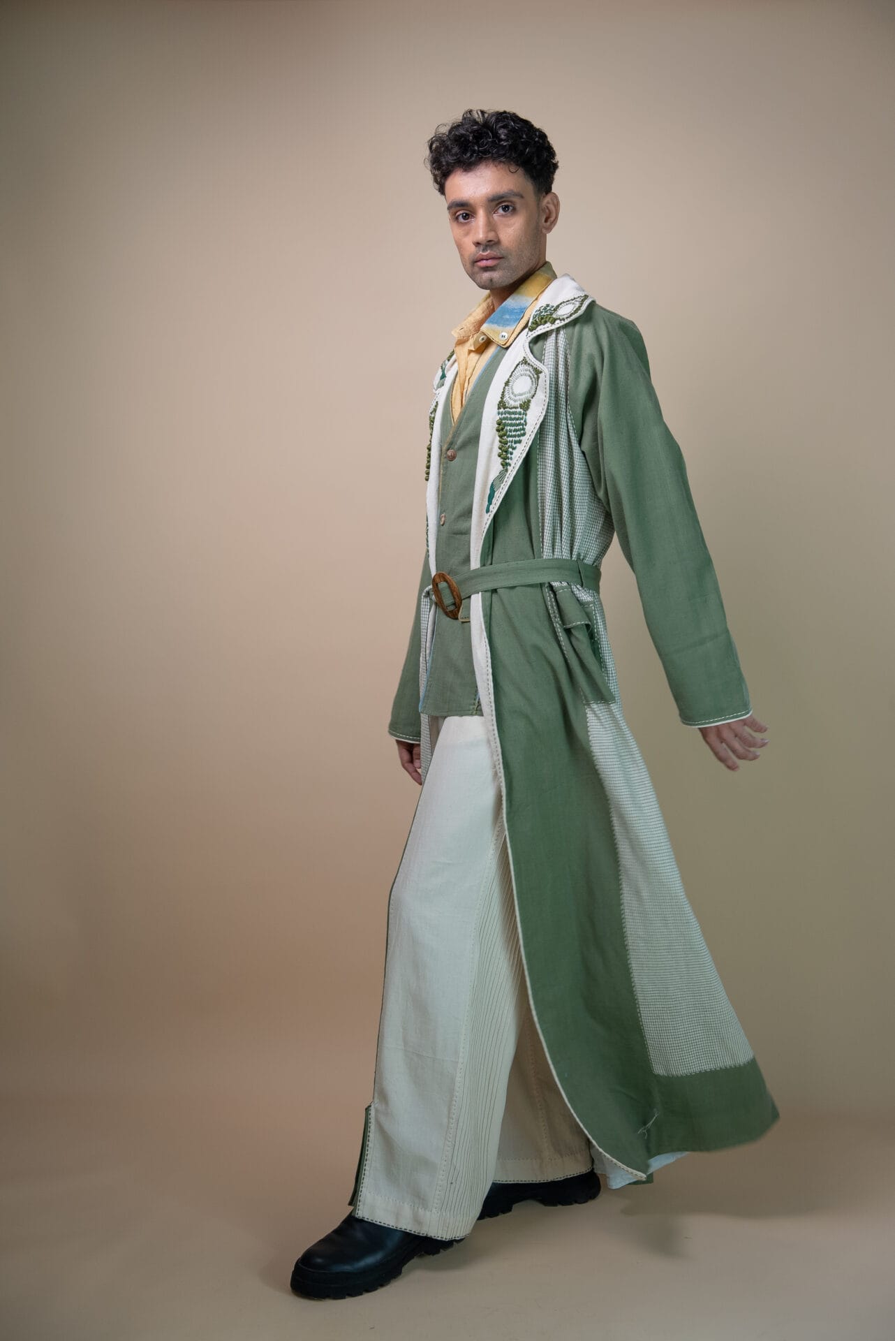 Featuring raglan sleeves and a wide lapel, the trench is accented with Kantha lines and contrasting olive piping along the lapel and front placket. This long trench is designed with high side slits, foldable cuffs, and patch pockets for added detail. Tonal embroidery incorporating French knots, bullion knots, lazy daisy stitches, and traditional Kantha work across the fabric, create an organic flow reminiscent of moss found growing along shaded forest floors, capturing the soft, uneven textures and deep, earthy greens that evoke a sense of natural tranquility.