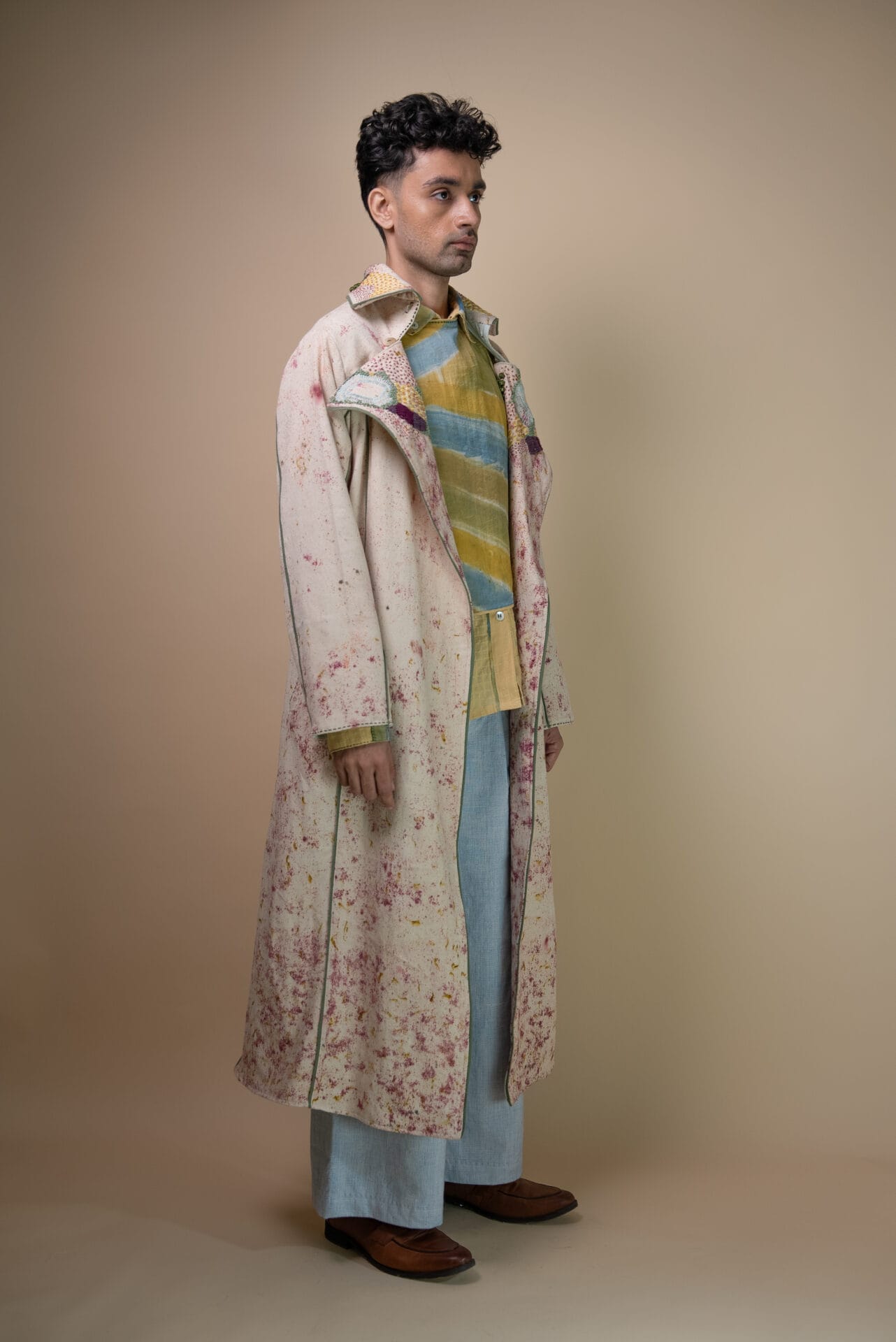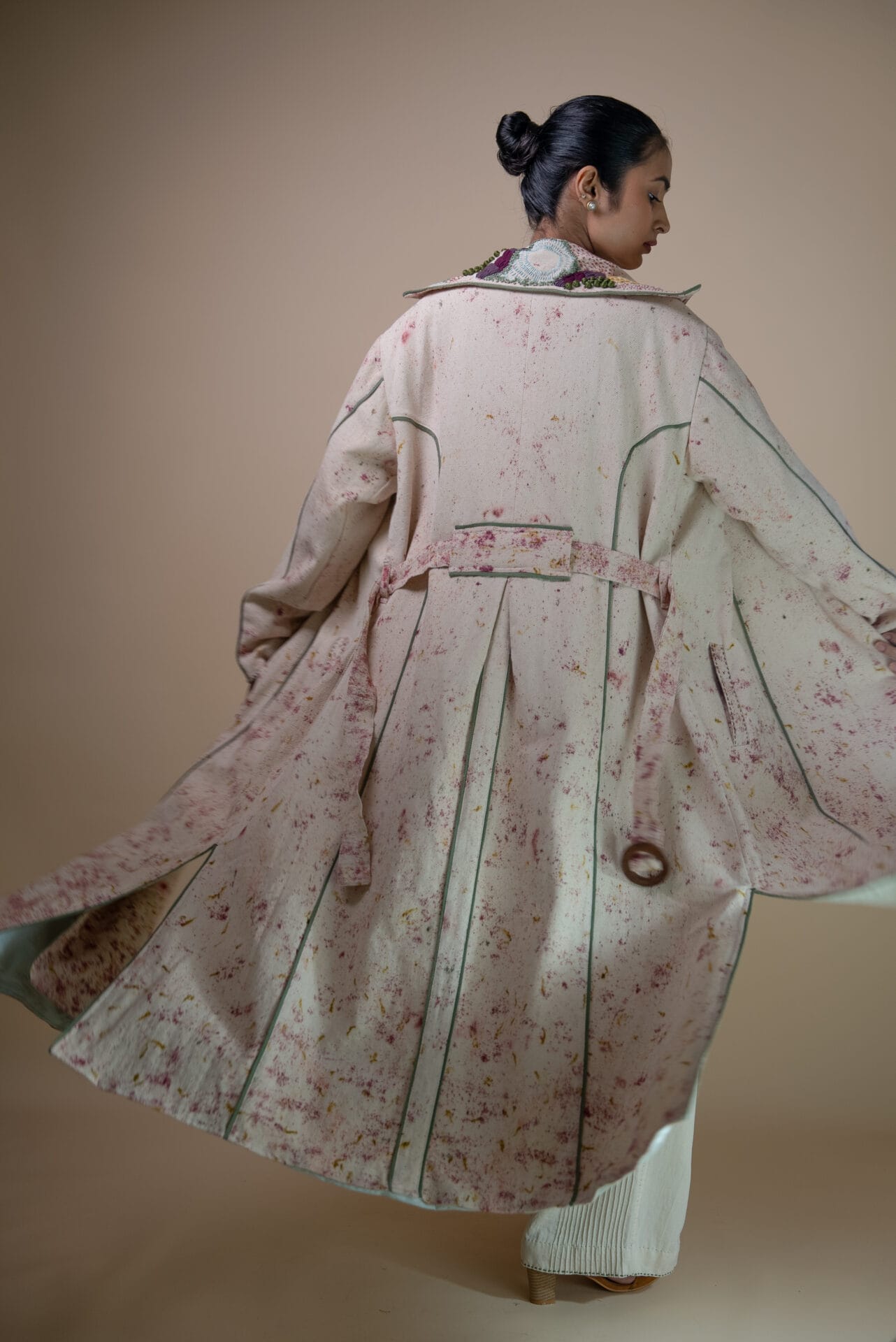 Intricate hand embroidery on the lapel showcases a blend of techniques-3D wooden bead embellishments, French knots, bullion knots, lazy daisy stitches, and traditional Kantha lines. Flowing organically from the lapel, the embroidery mimics the natural spread of moss, creating unique, uneven textures for each piece.