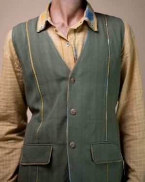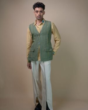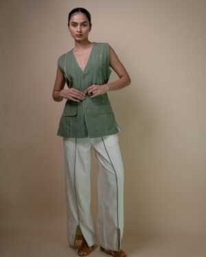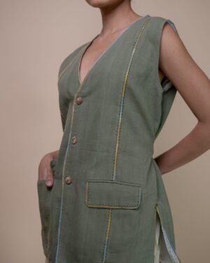 This simple vest transitions effortlessly through the seasons, making it a versatile addition to any minimalist wardrobe. Designed in a fresh warm tone, its understated panelling is enhanced by colourful mulmul piping, adding a subtle pop of colour. Wide tie-ups offers the option for a more cinched silhouette. Effortlessly versatile and timeless, this piece is perfect for creating an elevated look with ease.