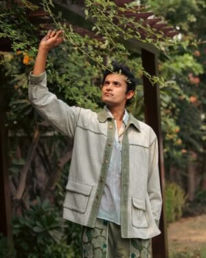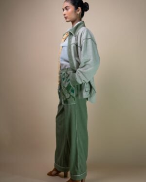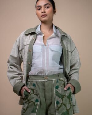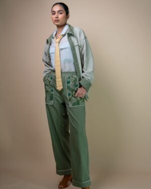 Designed with a high waist and straight-fit silhouette. The standout detail are the large patch pockets, adorned with tonal hand embroidery, combining embellishments such as wooden beads, French knots, bullion knots, lazy daisy stitches, and traditional Kantha lines. This organic embroidery mimics the natural spread of moss, giving the pockets soft and uneven textures with deep, earthy greens that evoke a sense of natural tranquility.