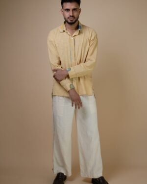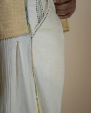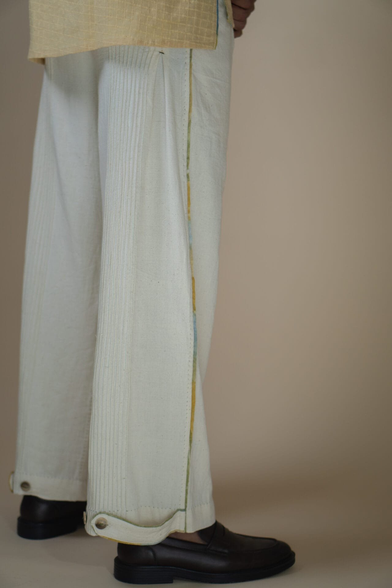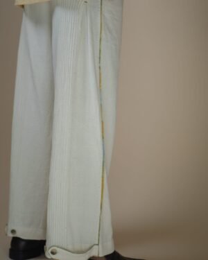 Featuring a high waist, straight silhouette, front pleats and pintucks at the back, the pants offer a relaxed yet elevated fit. An adjustable button loop detail allows you to cinch or adjust the hem, while piping details along all seams add colour to the otherwise off-white silhouette. A discreet drawstring ensures an adjustable fit, and traditional Kantha lines add to the handcrafted finish.