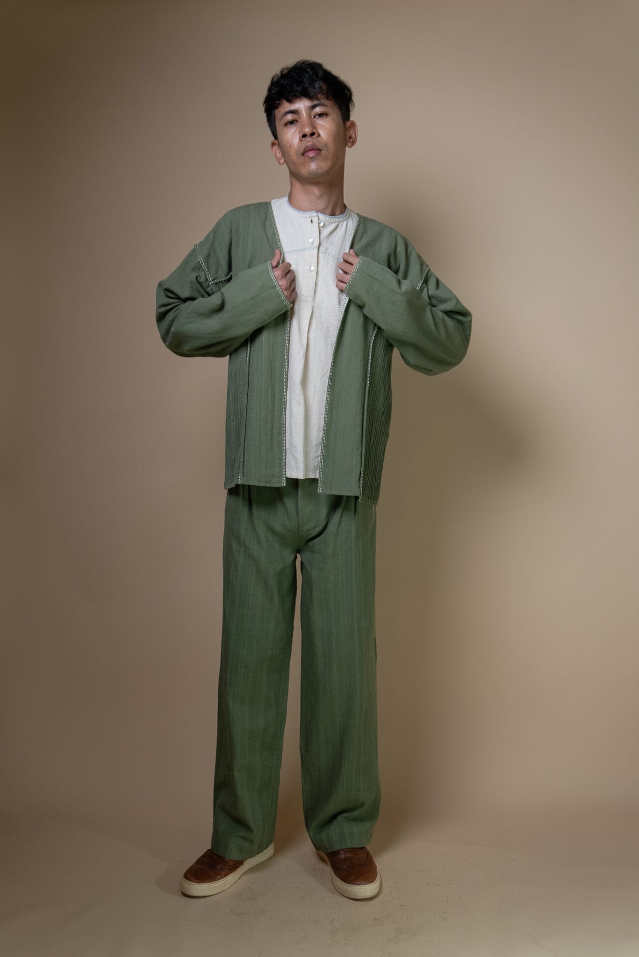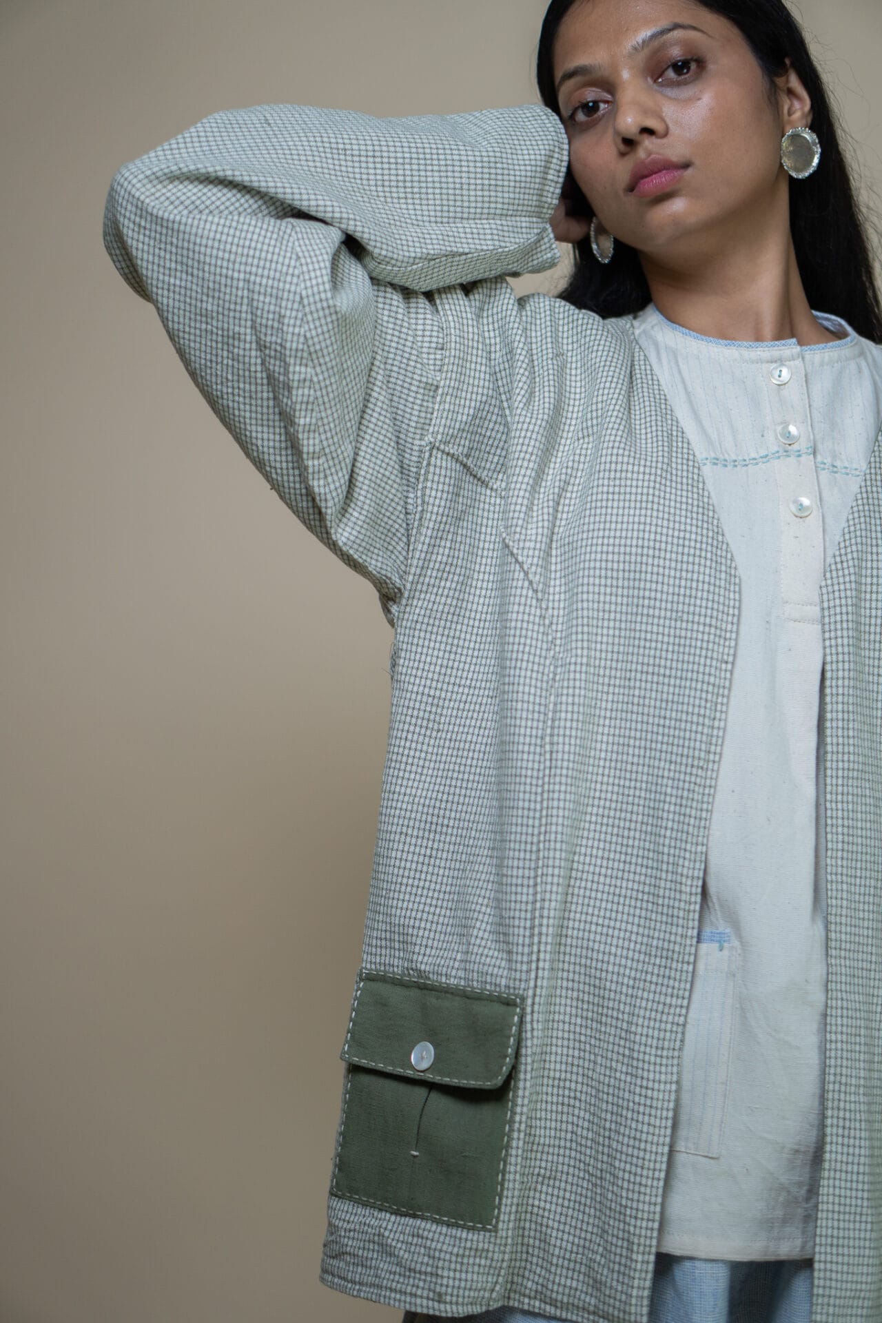 Designed with a relaxed fit and drop shoulders, this piece is the ideal trans-seasonal essential. Patch pockets and crisp pintucked panels on one side add a structured touch, while Kantha stitching enhances the clean contours. Cording along the panels introduces added texture, blending functionality with refined detailing.