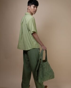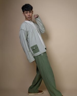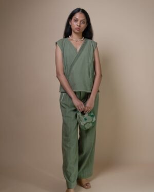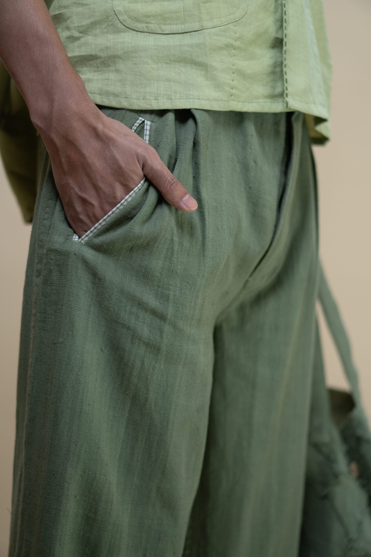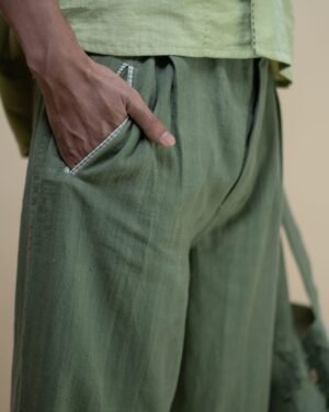 The design highlights the natural texture of Kala Cotton requiring only minimal embellishment to tie it all together. Featuring a high waist, slightly tapered silhouette, and front pleats, the pants offer a relaxed yet neat fit. A foldable hem reveals olive checkered fabric underneath, while discreet drawstrings ensures an adjustable fit. Traditional Kantha lines adds to the understated appeal of the pants.