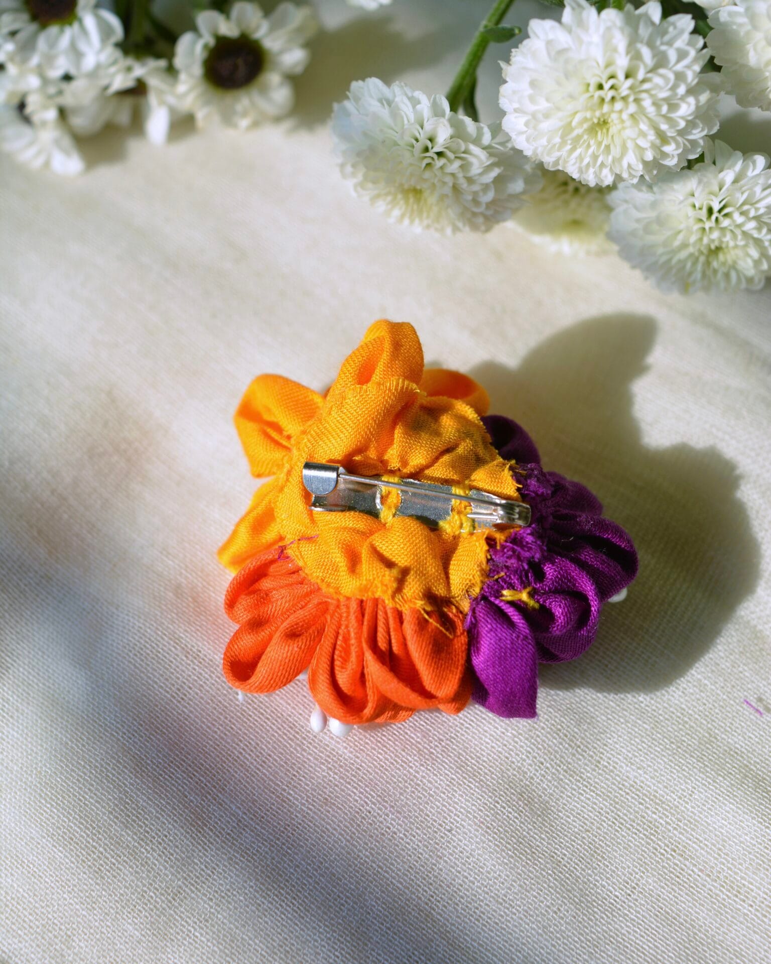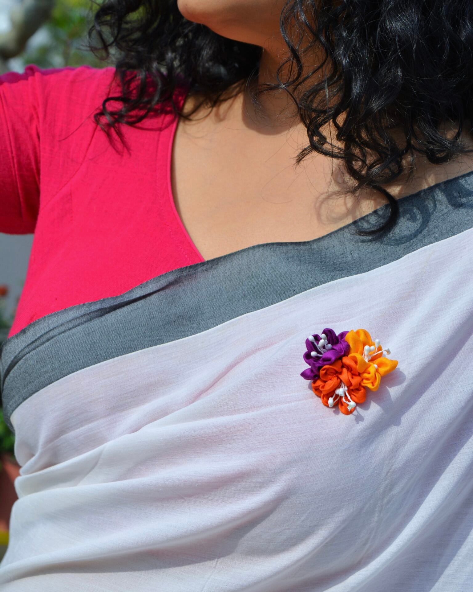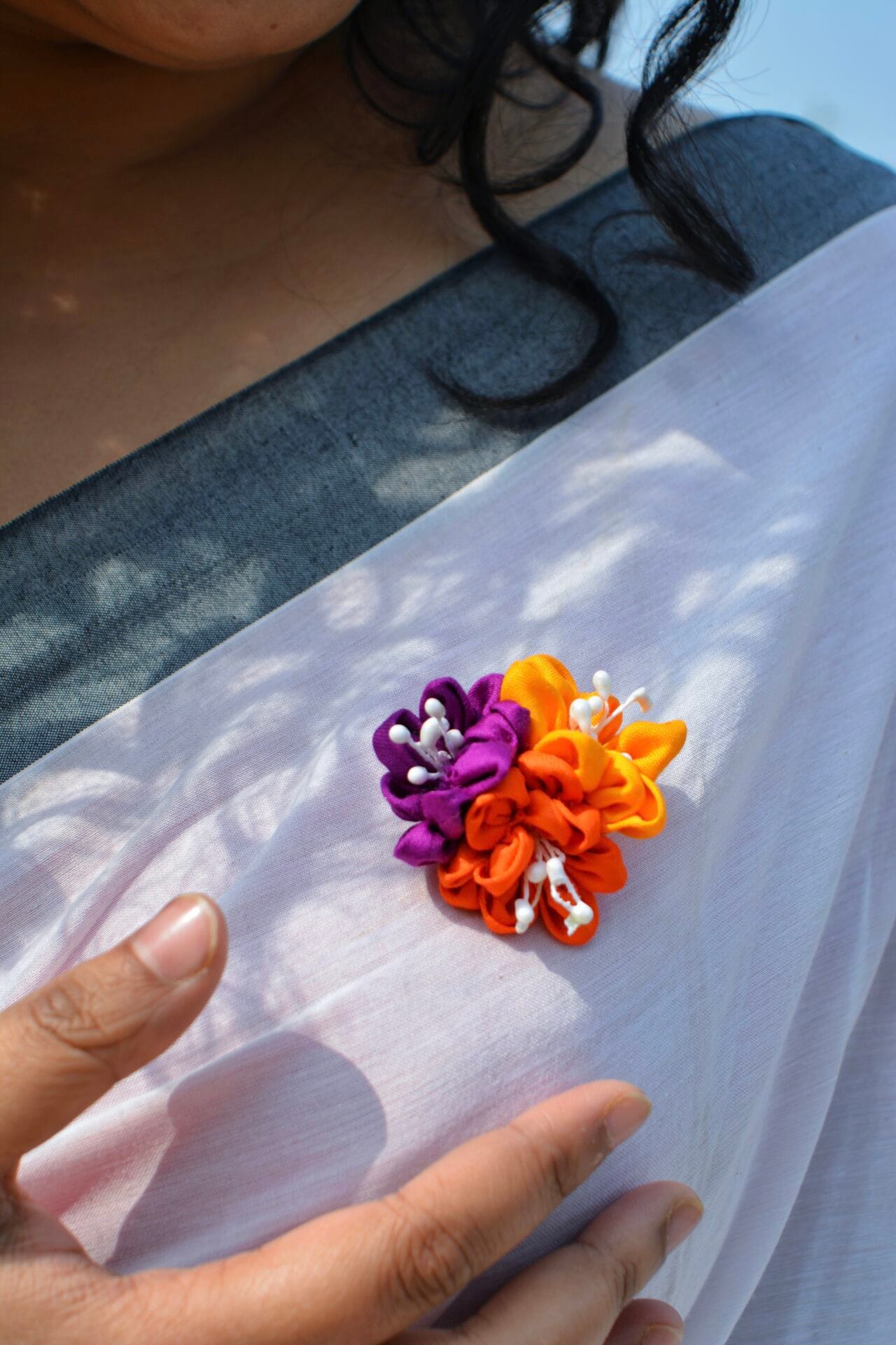 The Mehek brooch is a captivating accessory that epitomizes elegance and craftsmanship. Handcrafted with meticulous attention to detail, this exquisite piece features three fabric flowers in an array of vibrant colors—a harmonious blend that transcends traditional adornment. Designed to be worn on a sari or any monochrome outfit, the Mehek brooch serves as a transformative element, instantly elevating the wearer’s ensemble.