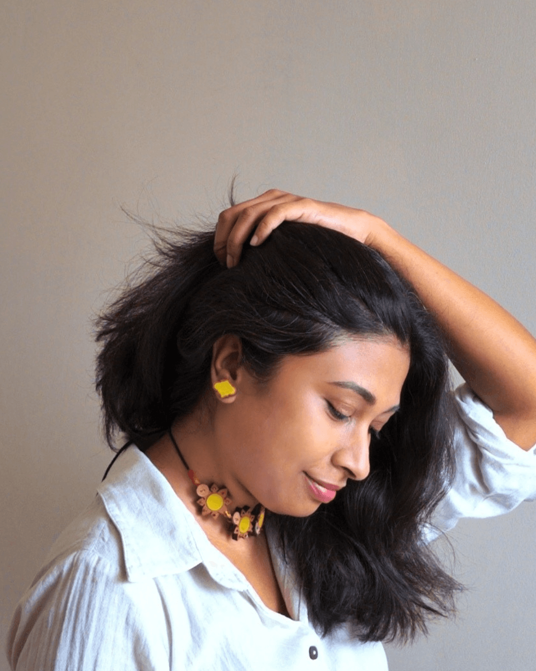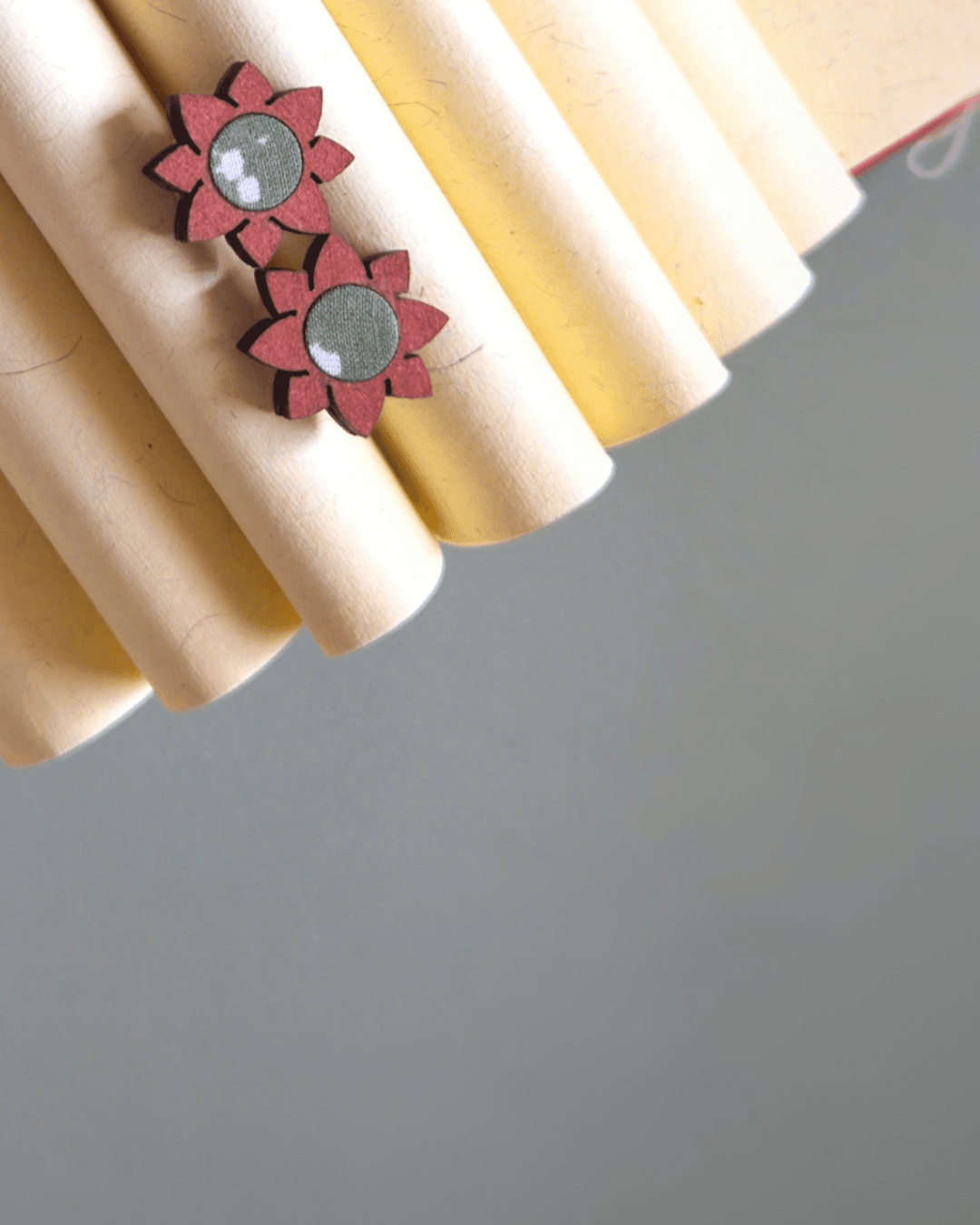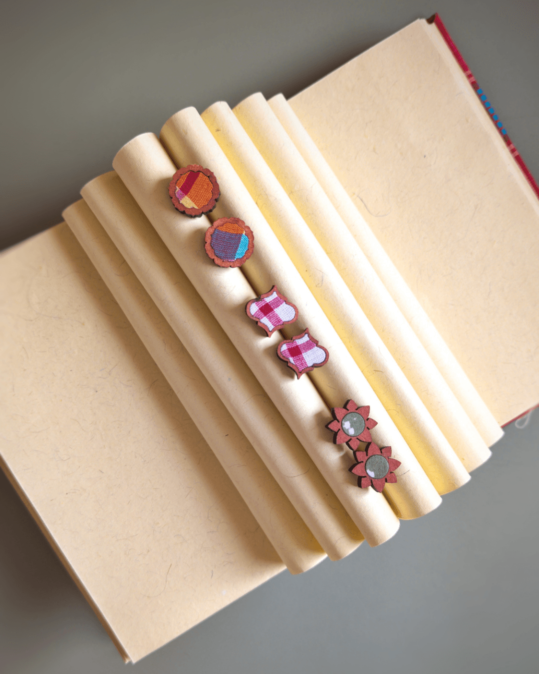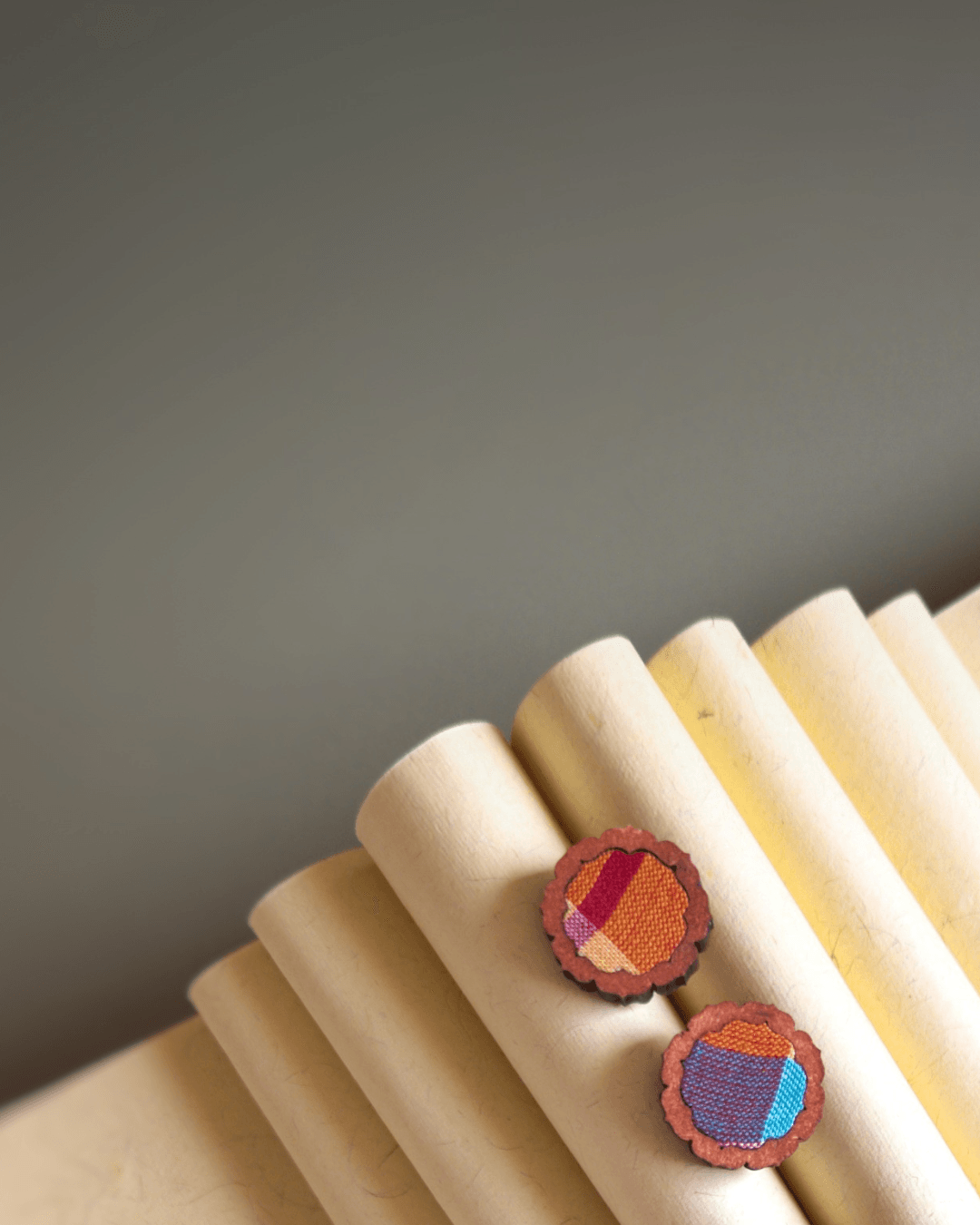 Inspired by Jaipur’s jharokha windows, the Sitara Mini Studs blend upcycled textiles with recycled wood, creating a lightweight, heritage-inspired accessory. Each pair is unique, handcrafted with Maati’s signature sustainable touch.