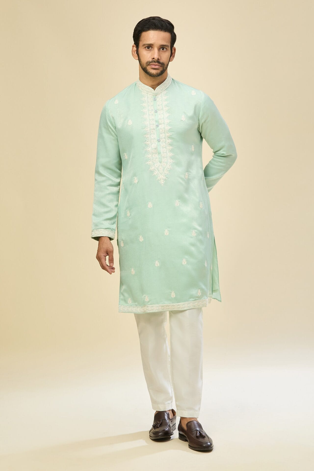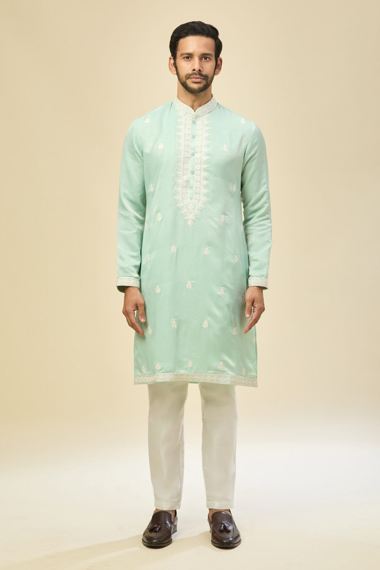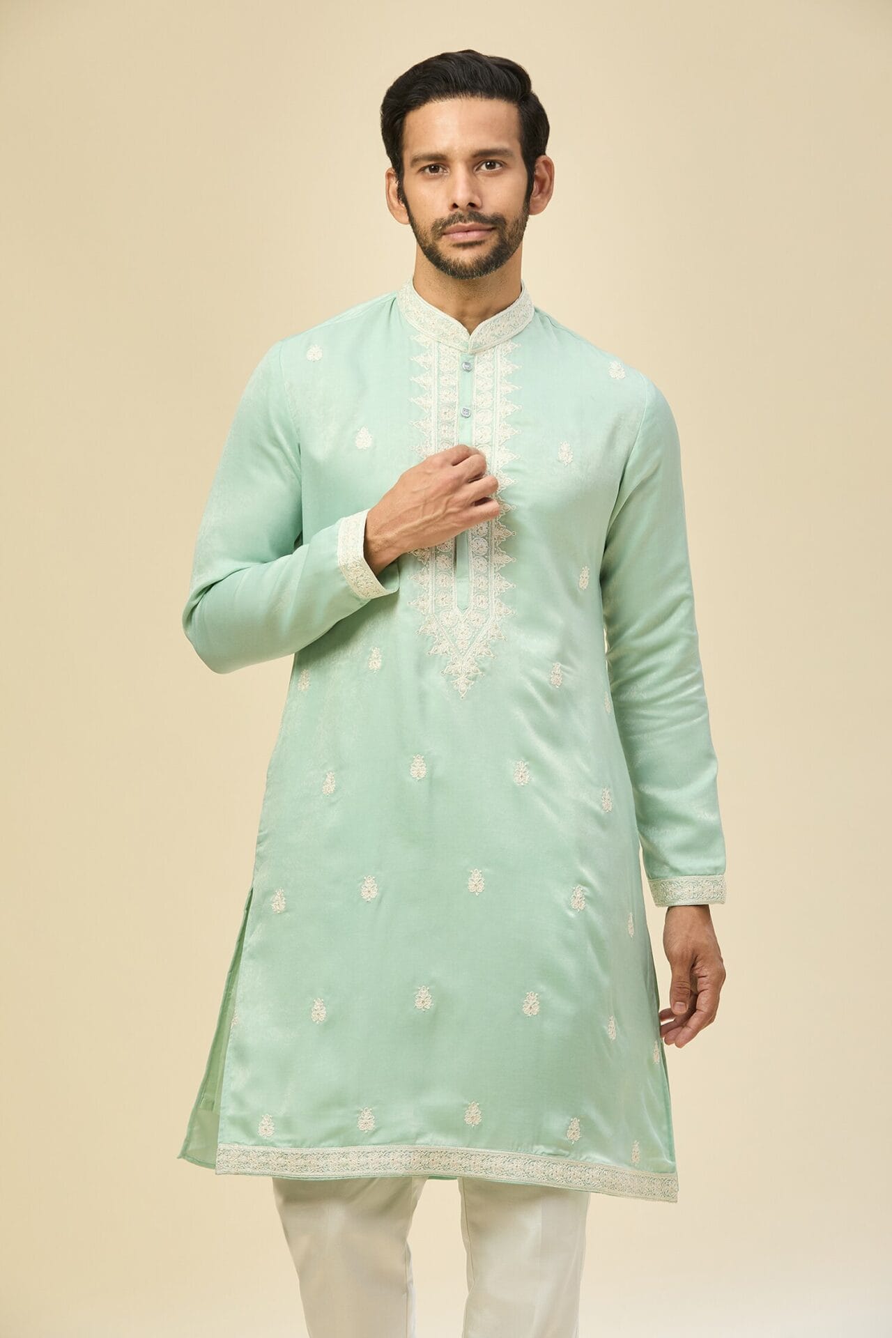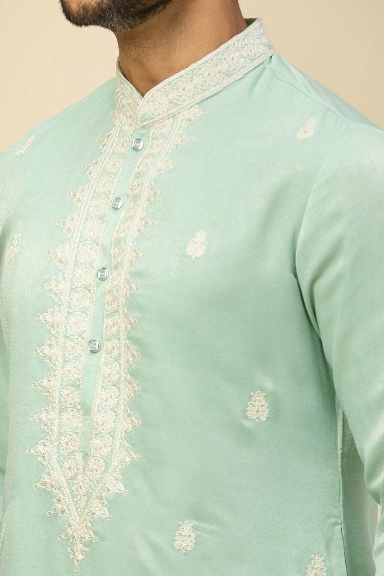 Mint Blue silk based kurta enhanced with white dori and sequins embroidery paired with an off white dupion silk based mexican pants.