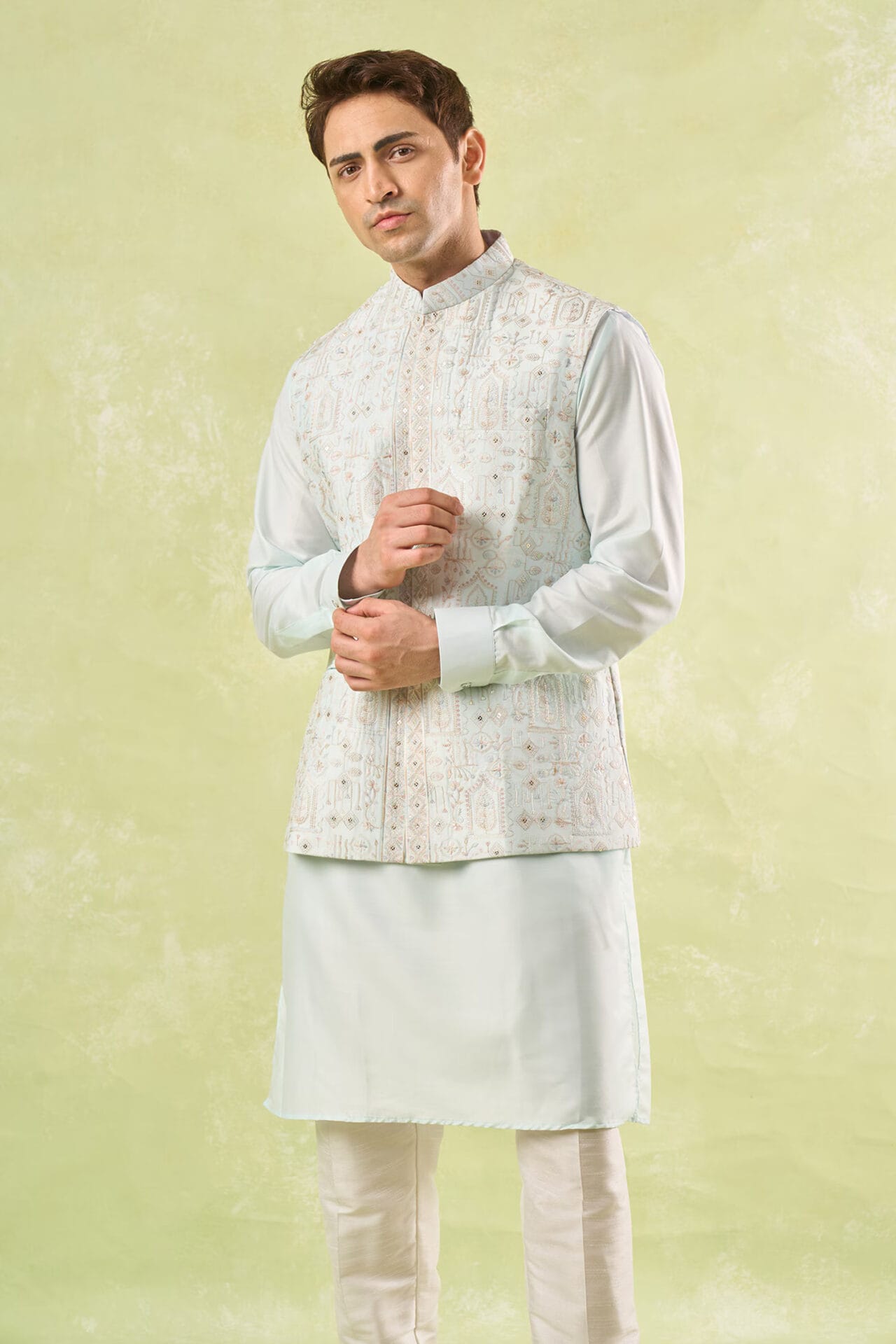 Mint Green raw silk based jacket enhanced with thread and sequin embroidery paired with a matching cotton silk based kurta and an off white dupion silk based mexican pants.