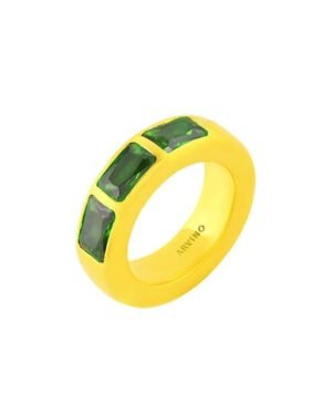 The Modern Mosaic Ring Green showcases a striking trio of rectangular bezel-set stones in vibrant shades of green. This