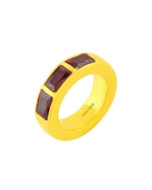 The Modern Mosaic Ring Red features a stunning arrangement of three rectangular bezel-set stones in rich, fiery red hues