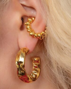 Redefine Elegance with Organic Artistry The Molten Amorphous Bead Ear Cuff is where contemporary art meets wearable luxury. Inspired by the fluid movement of liquid metal, this ear cuff boasts an irregular, "amorphous" bead design that catches the light from every angle.Premium Craftsmanship Unlike standard fashion jewelry, this piece is built on a premium brass alloy base, ensuring durability and a lightweight feel for all-day comfort. The 22KT real gold plating provides a rich, deep luster that mimics solid gold, making it a staple for your luxury collection.Key Features:Design: Amorphous, molten-metal aesthetic for a unique, artisanal feel.Material: High-quality Brass Alloy with a thick layer of 22KT Gold Plating.Fit: Adjustable and secure; no piercing required.Style Tip: Pair it with minimalist gold studs or wear it alone as a bold statement piece.Packaging: Comes in a signature Toilee De Designers gift box, perfect for gifting.Care Instructions: To maintain the 22KT glow, avoid contact