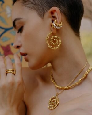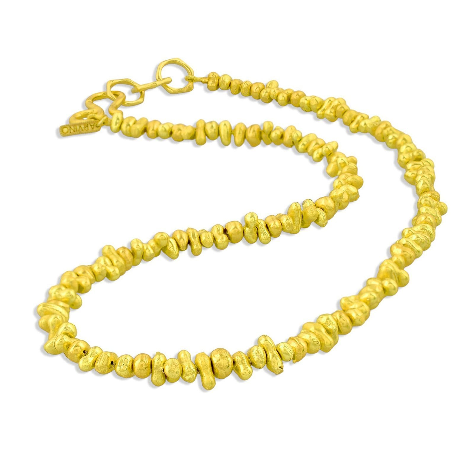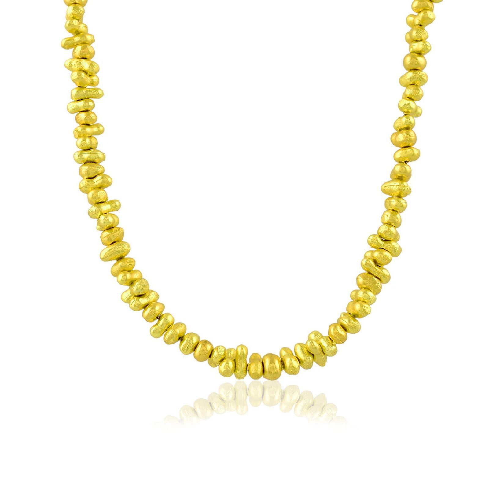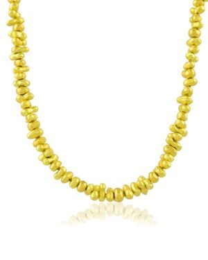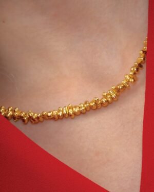 Make a modern style statement with our Molten Amorphous Beaded Necklace, designed for women who love contemporary, artistic jewelry. Featuring uniquely shaped abstract molten-inspired beads, this necklace is finished with 22KT real gold plating over a high-quality brass alloy base.The fluid, organic bead design reflects modern minimal luxury while remaining lightweight and comfortable for extended wear. Whether styled with western outfits, festive attire, or elevated everyday looks, this necklace adds effortless sophistication. Key Features:Contemporary molten amorphous beaded design22KT real gold plating for rich shinePremium brass alloy base for durabilityLightweight & skin-friendly constructionStatement yet minimal aestheticLong-lasting finish with proper care Ideal For:Daily wear & office stylingFestive and evening looksModern minimalist jewelry loversThoughtful gifting for womenEach necklace is carefully crafted to maintain uniqueness in bead shape and texture.