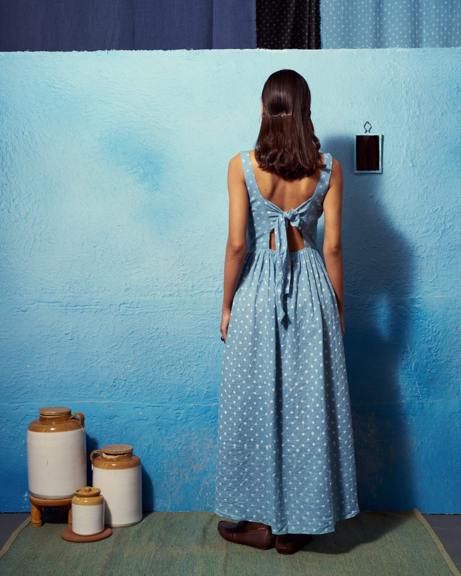 Crafted from soft, breathable cotton, this piece features a square neckline and broad shoulder straps that lend a structured, flattering look. The pleated bodice detail adds a touch of elegance and refinement. A gathered waistline gently flows into a voluminous, flared skirt. The highlight of the back design is a statement knotted tie. A fluid silhouette that moves with you ? timeless, grounded, and softly powerful.