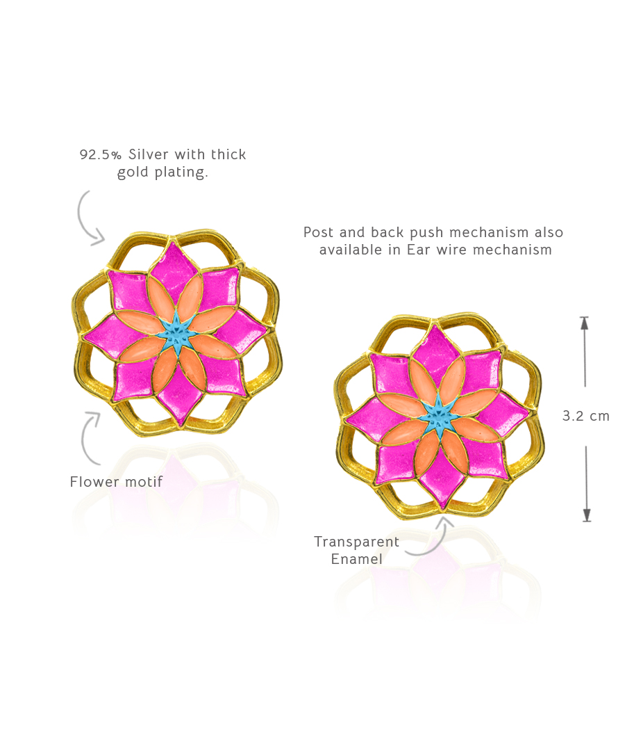 These studs are handcrafted in 92.5% sterling silver, with thick gold plating and has an anti tarnish protective coating. It has transparent enamel details in vibrant color, with flower motif design. Comes in a post and back push mechanism., Plating: Gold Plated, Metal Type: 92.5% Sterling Silver, Enamel / plating / gemstone: Transparent Enamel, Lock Mechanism: Post and push back, Measurement cm : 3.2 cm, Measurement inches: 1.25 inch , Care Instruction: Keep away from water, perfume and other liquids. Do not use any cleaning agents. Clean when storing in the provided pouches. Store them in moisture free areas and keep them away from water and liquid fragrances.