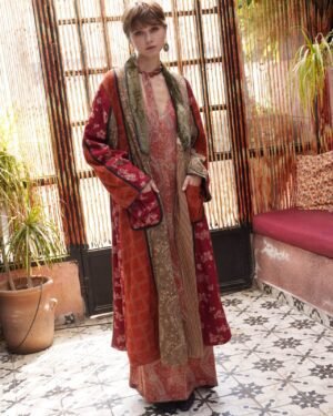 Olive paisley, maroon floral, rust checks printe and all over butterfly embroidered viscose textured color block jacket with velvet quilted collar and blanket stitch detail