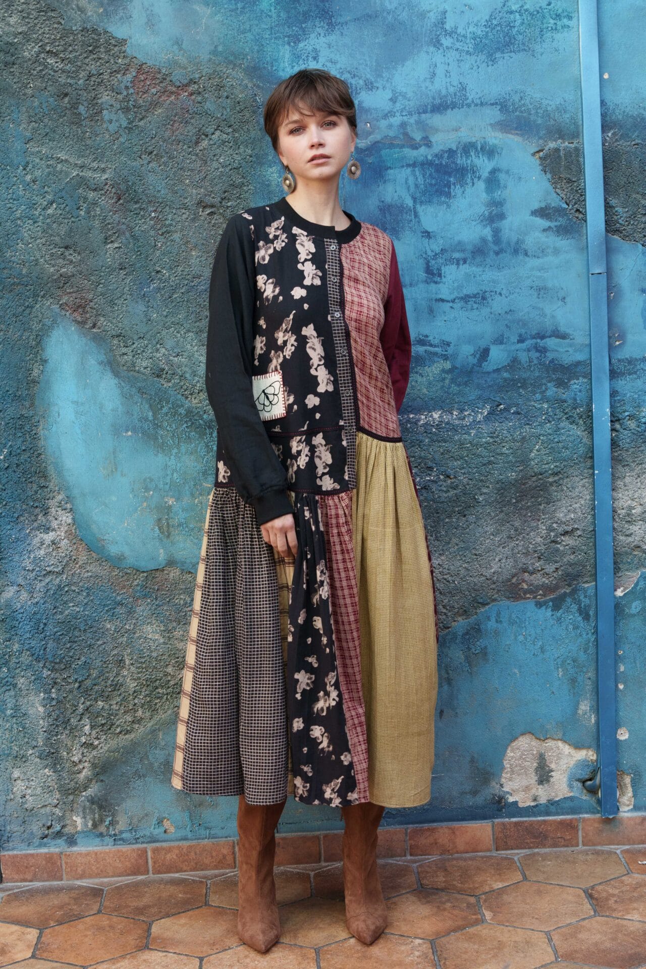 Multi color printed paneled dress with embroidery