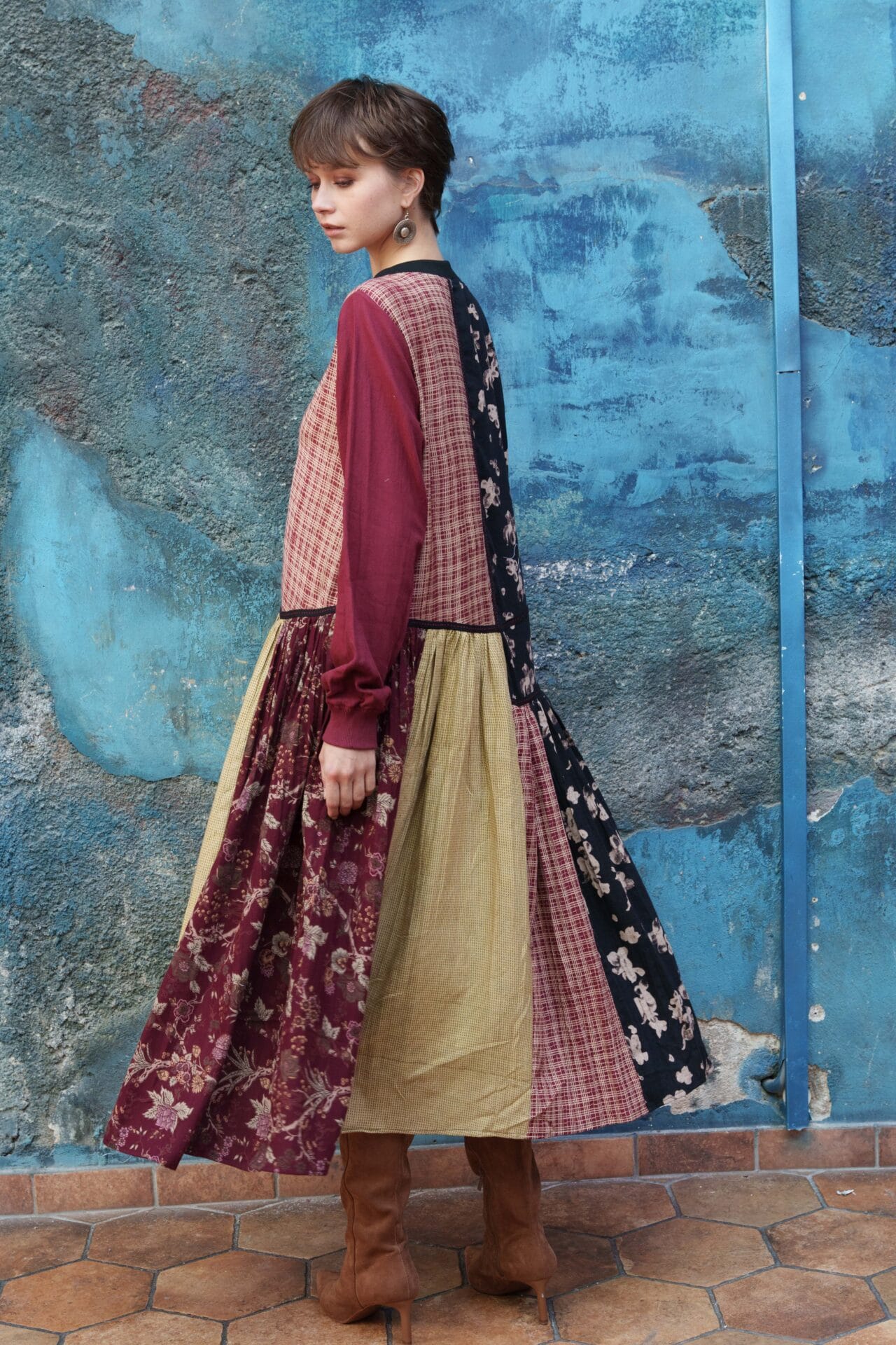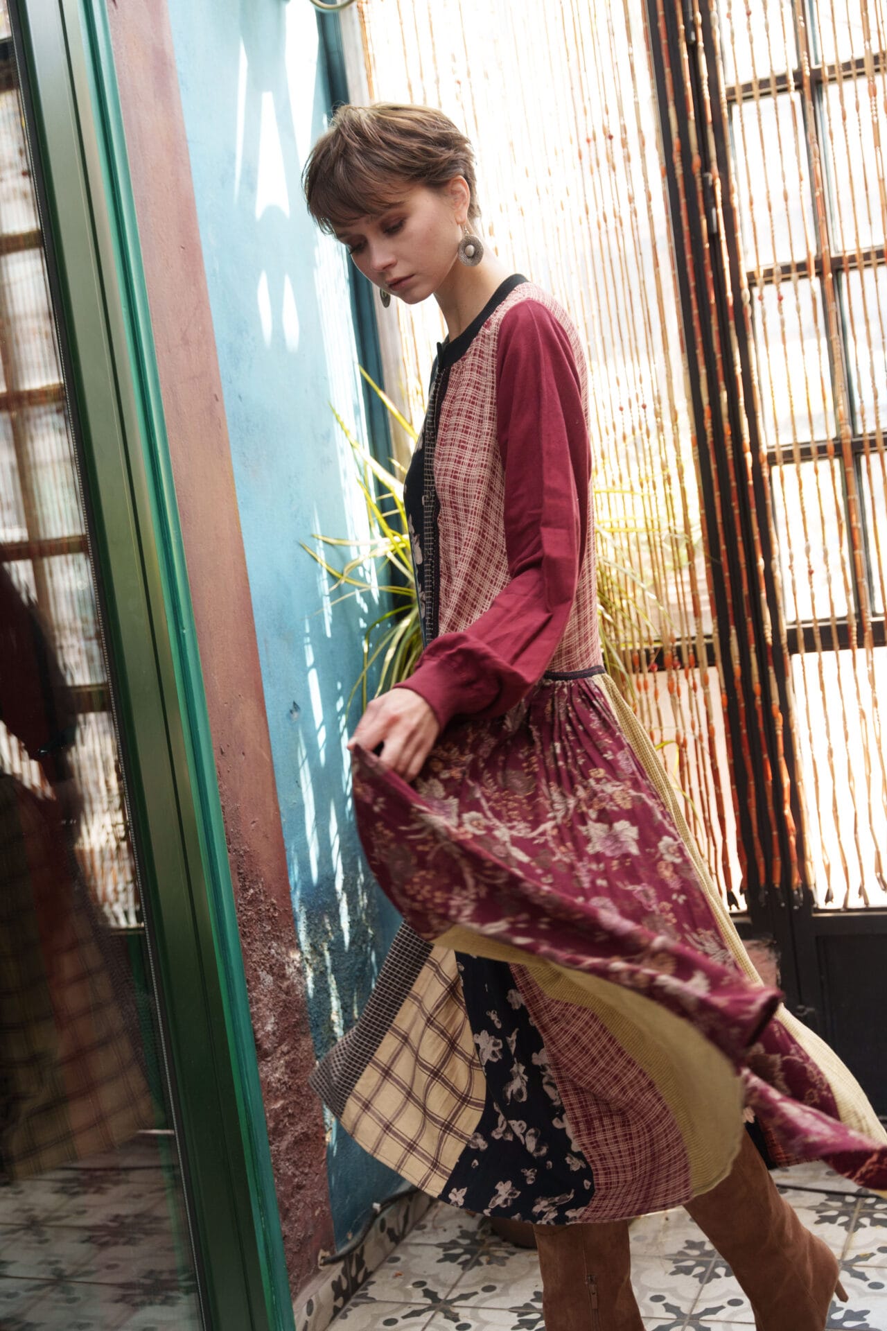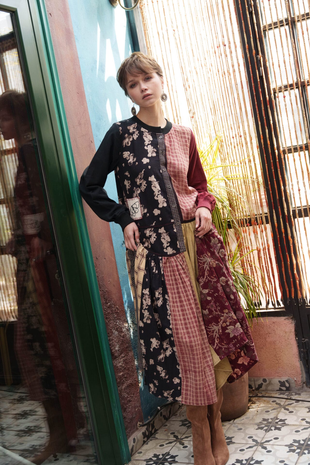 Black, red, olive, chintz, beige and checks printed color block gathered dress with ladder lace