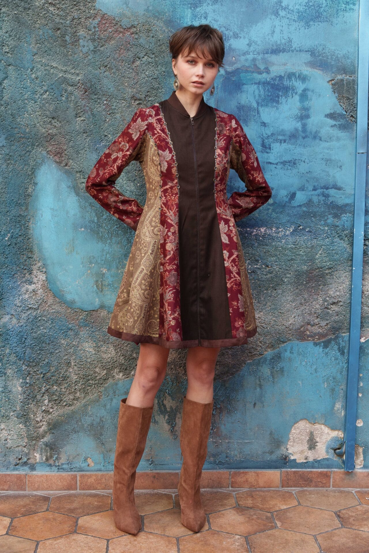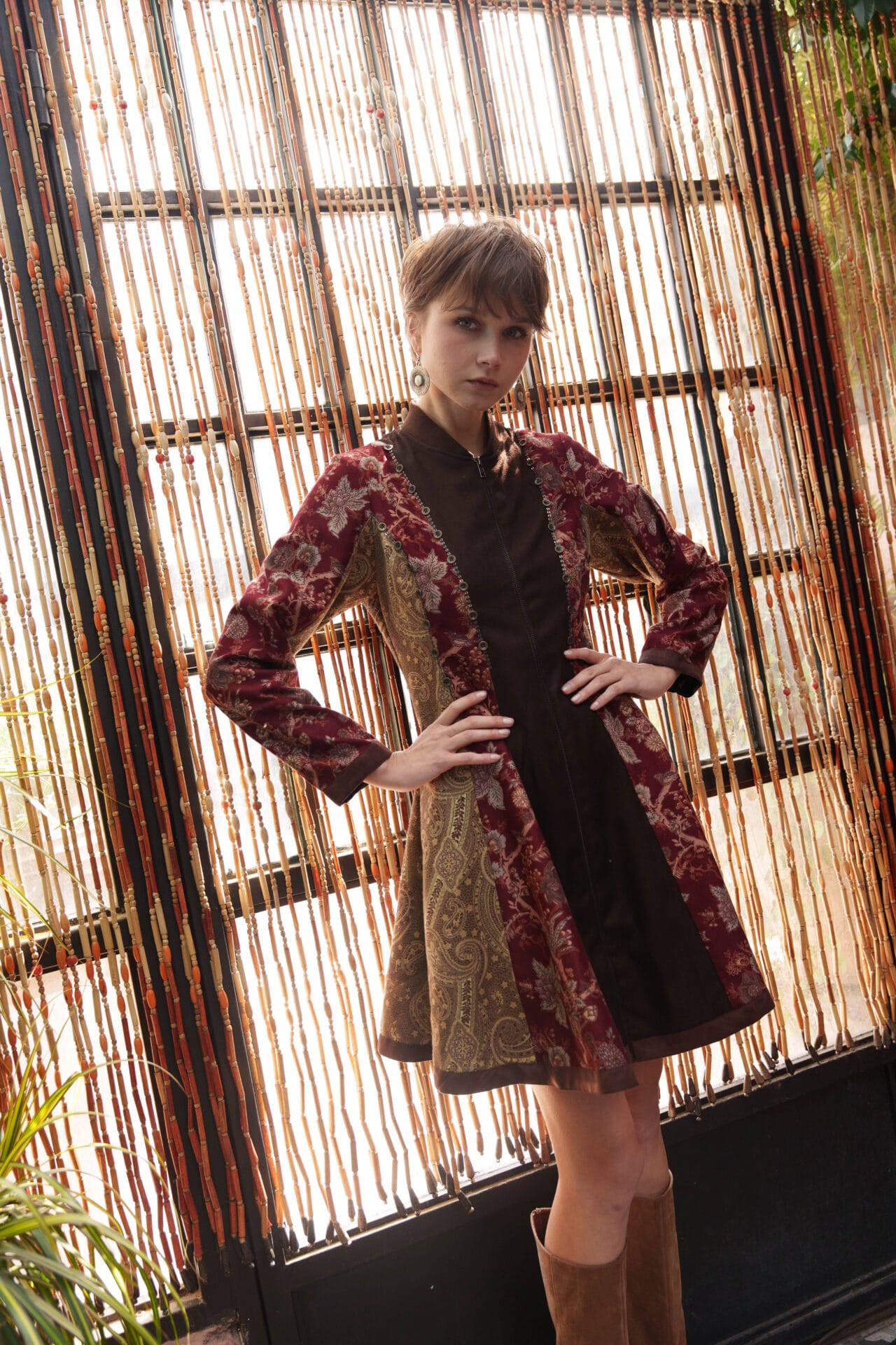 Brown solid, olive paisley and maroon chintz printed front open short dress with suede detail and rib collar