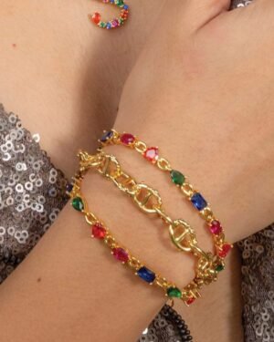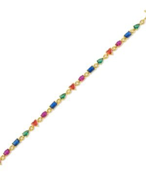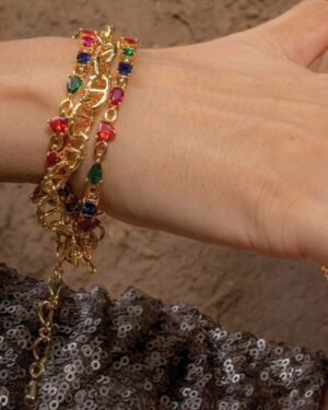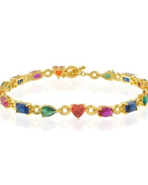 Embrace the Colors of Life with the Multihued Crescendo BraceletBring a pop of color to your accessory collection with the Multihued Crescendo Bracelet?a stunning piece designed for women and girls who appreciate both style and elegance. This vibrant rainbow bracelet features beautifully set stones that create an eye-catching display of colors, making it the perfect accessory for any occasion.Key Features:Rainbow-Colored Stones: Each stone is carefully selected to offer a dazzling range of hues, from vibrant reds to cool blues.22KT Real Gold Plating: Adds a luxurious finish to the bracelet, enhancing its beauty and durability.Premium Brass Alloy: Crafted from high-quality material for long-lasting shine and strength.Adjustable Design: Fits comfortably on a wide range of wrist sizes for a perfect fit.Versatile and Stylish: Ideal for casual wear, special occasions, or as a gift to someone special.Whether you're attending a party, going out with friends, or simply want to brighten your daily look,