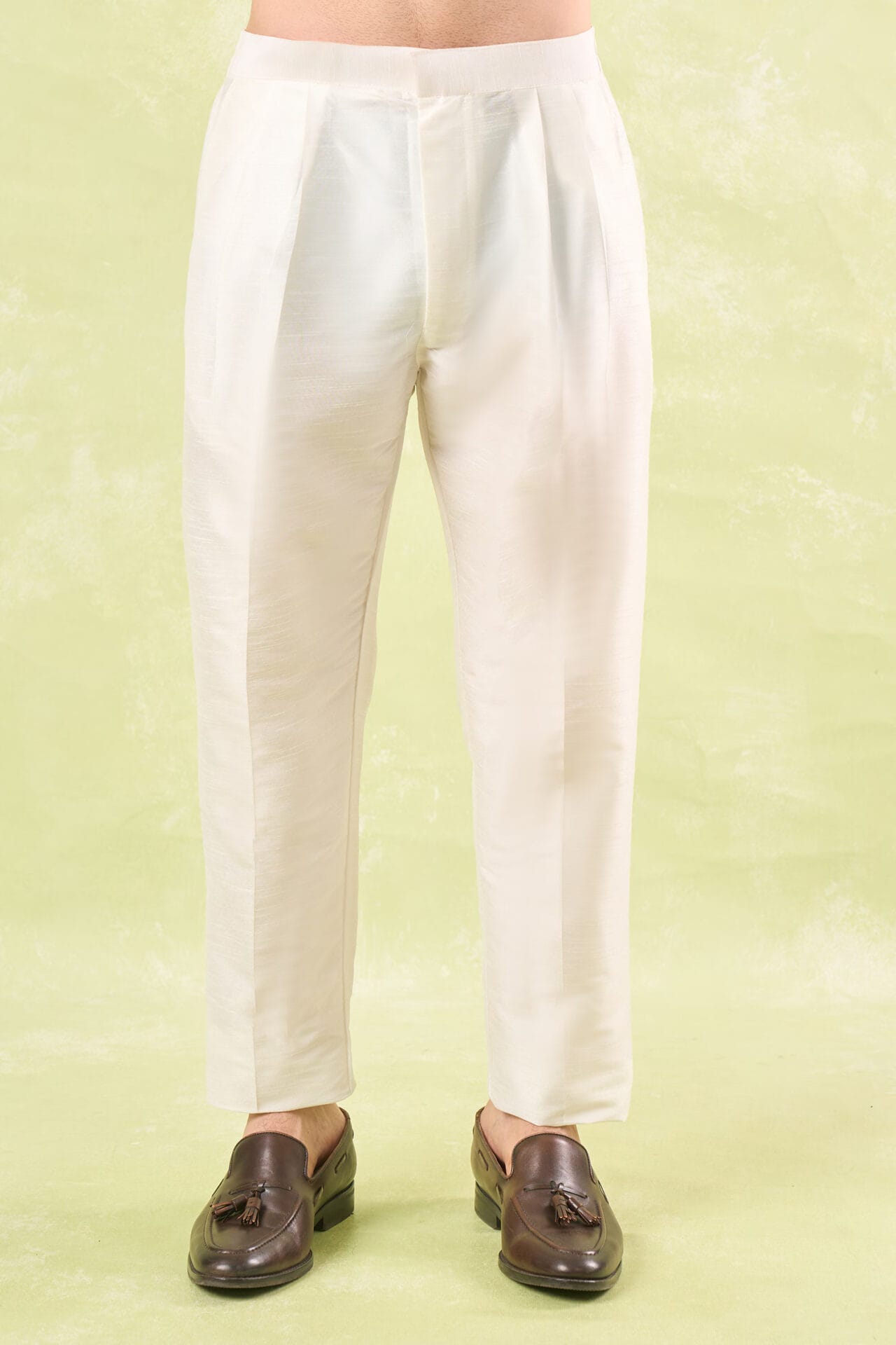 Mustard cotton silk based kurta enhanced with mirror embroidery paired with an off white dupion silk based mexican pants.
