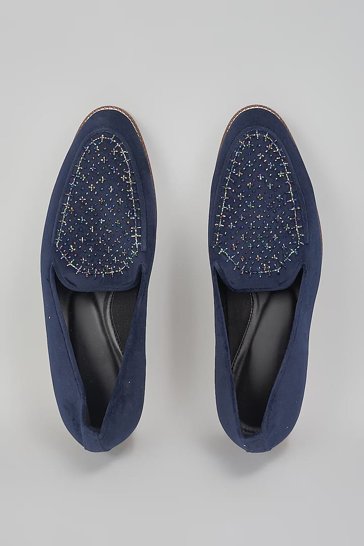 A pair of navy blue suede based slip on shoes enhanced with all over hand embroiderered stones and beads. It has a padded leather lining and a hard sheeted rubber sole.