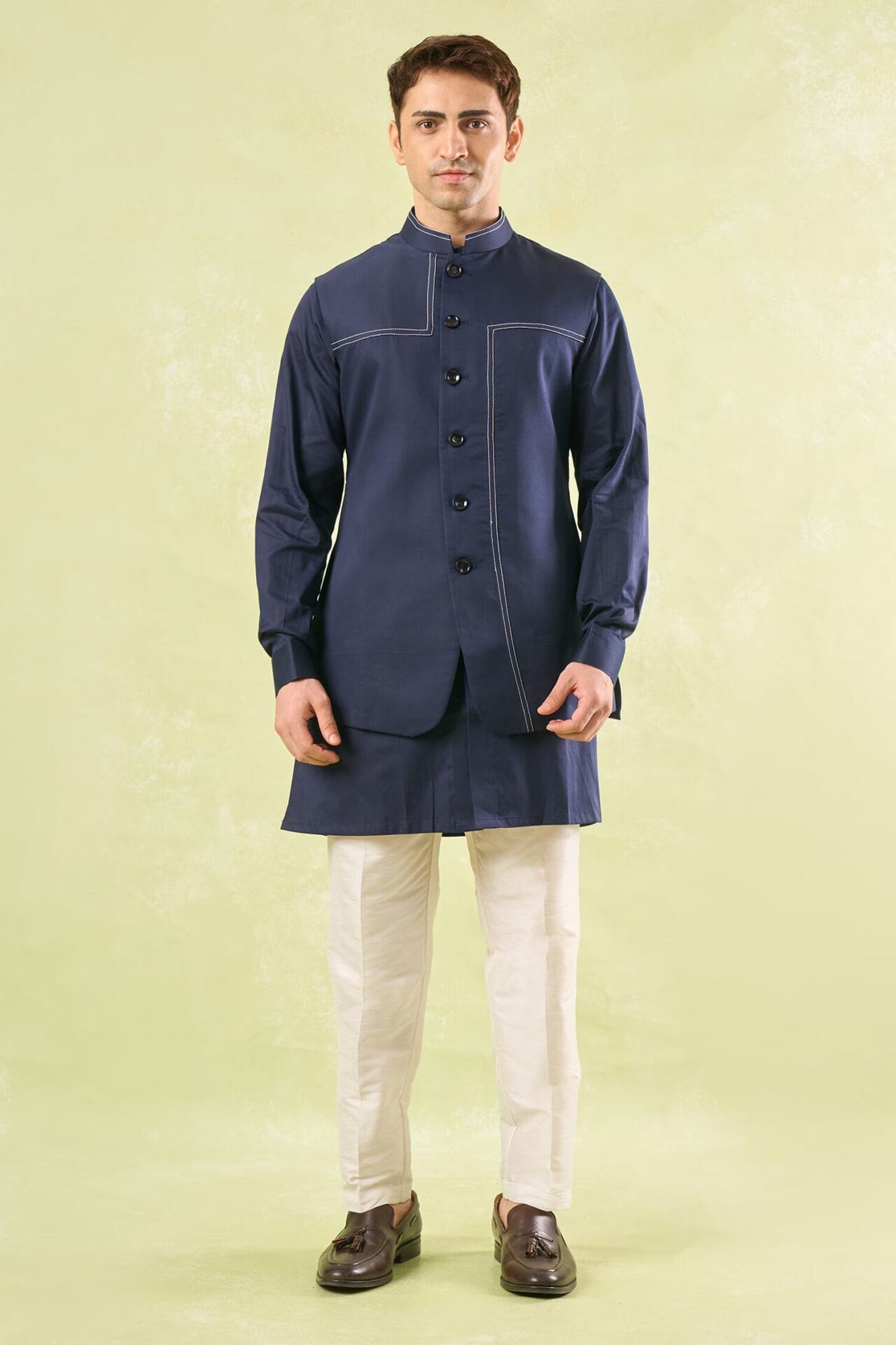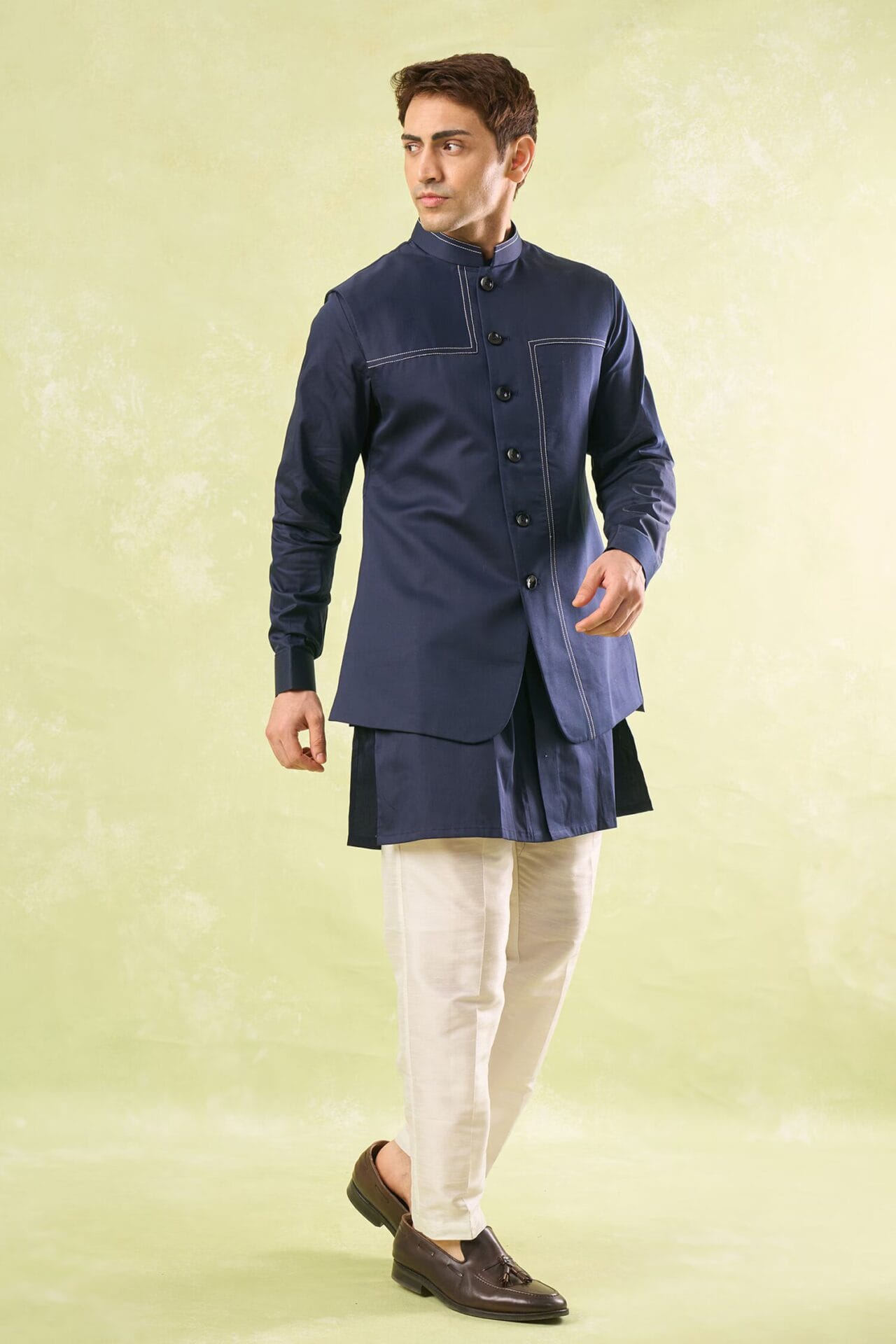 Navy Blue crepe silk based jacket enhanced with running stitch detailing paired with a matching crepe silk based kurta and an off white dupion silk based mexican pants.