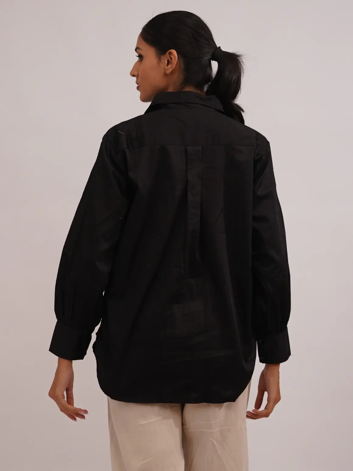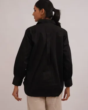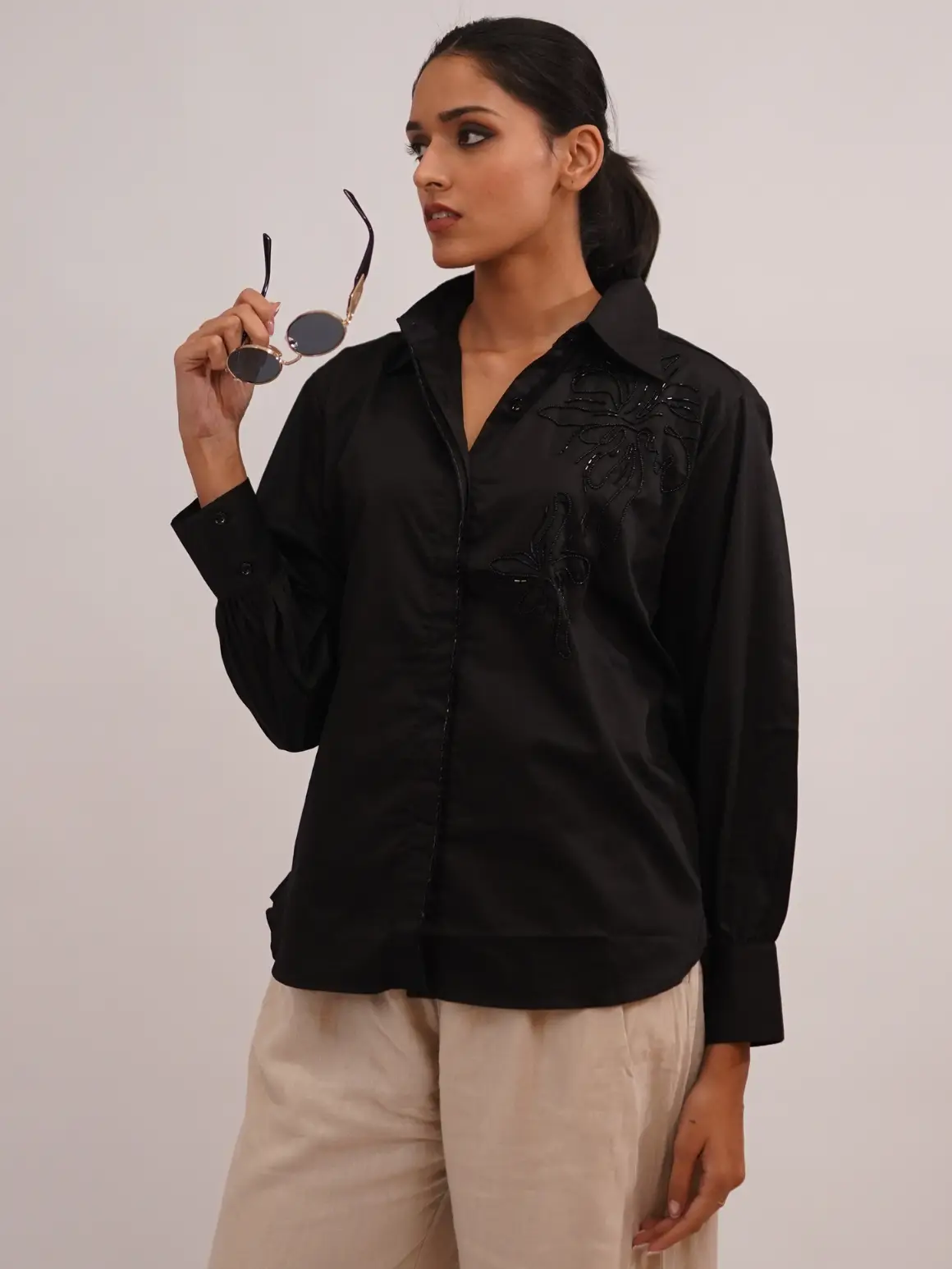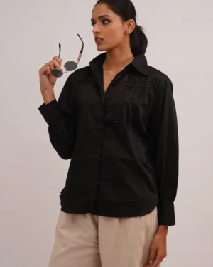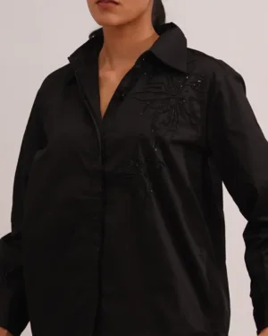 Timeless sophistication, redefined.This classic black shirt embodies quiet luxury with tonal bead embroidery that subtly catches the light, adding depth and allure to its minimal design. Tailored from a soft satin-cotton fabric, it offers a perfect balance between structure and comfort — making it a versatile wardrobe essential that transitions effortlessly from day to dusk.