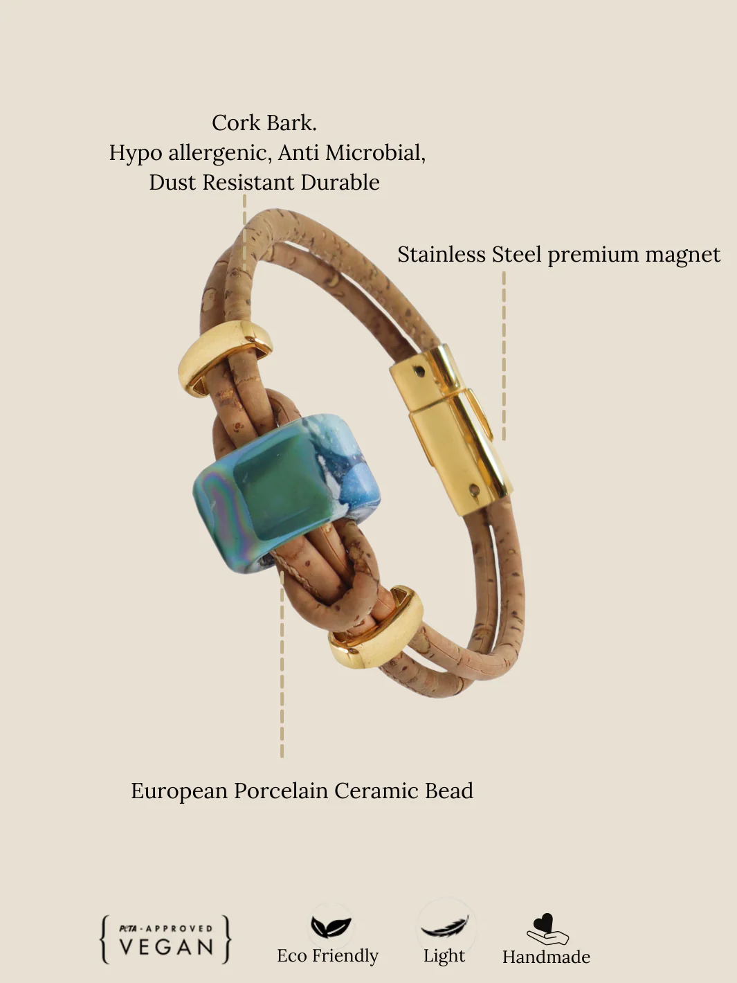 Introducing our Northern Light Vegan bracelet, a contemporary piece of jewellery inspired by the mesmerizing green hues of the aurora borealis. Handcrafted from sustainable Cork Oak Tree bark and adorned with iridescent porcelain ceramic beads, this bracelet is a stunning representation of eco-friendly, modern jewellery.