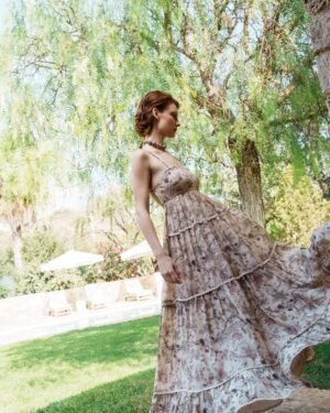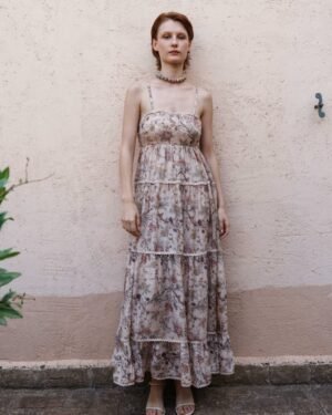 Crafted in fine fabric, this Nude chintz printed tiered midi dress with lace printed bodice showcases Pinnacle by Shruti Sancheti?s timeless craftsmanship and feminine grace. A perfect piece for effortless day-to-evening elegance.