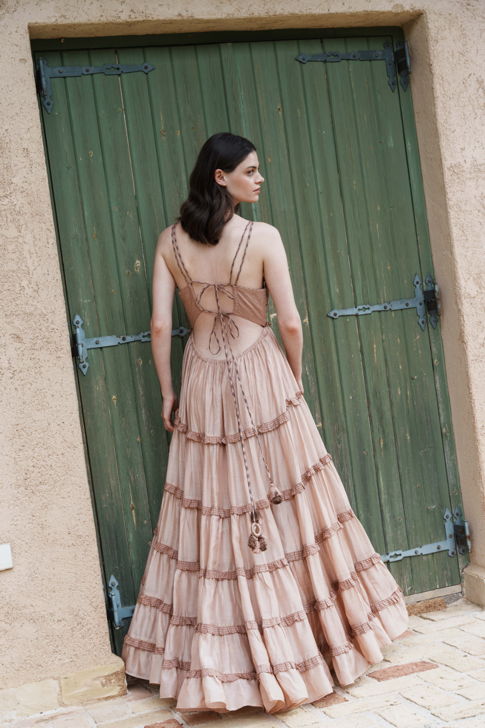 A beautifully detailed Nude mul tiered maxi with embroidered bodice that reflects Pinnacle by Shruti Sancheti?s artisanal precision and timeless design language.