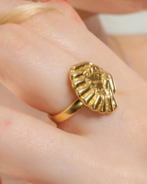 The Oasis Shell Ring brings the tranquillity of the sea to your fingertips. This elegant sea shell ring is crafted with premium brass alloy and plated with 22KT real gold, creating a luxurious, yet lightweight piece that is perfect for daily wear or special occasions.The unique shell design is symbolic of the ocean's natural beauty, making it ideal for those who love coastal or nature-inspired jewelry. Whether you're drawn to the charm of the sea or simply want to wear a piece that exudes elegance, the Oasis Shell Ring will be a standout in your collection.Its smooth finish and intricate shell detailing make it an ideal accessory for all types of outfits, from casual beachwear to more formal attire. With a nickel-free and lead-free composition, this ring is skin-friendly, ensuring comfort even with long-term wear.Perfect for:Nature-inspired jewelry loversBeach and ocean loversUnique everyday accessoriesThoughtful gifts for birthdays, anniversaries, or beach holidaysElegant