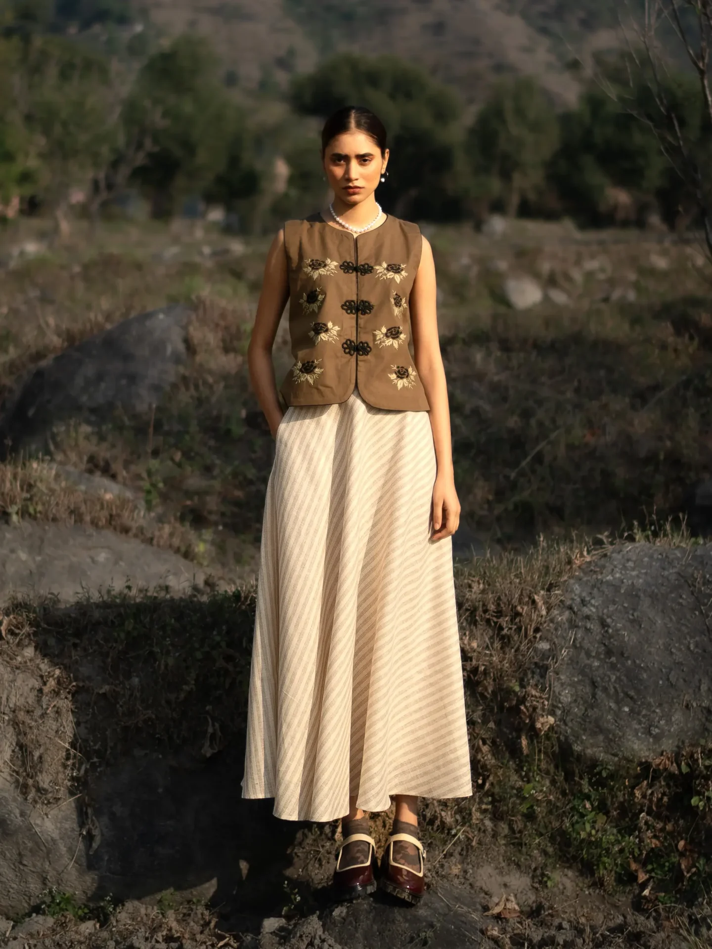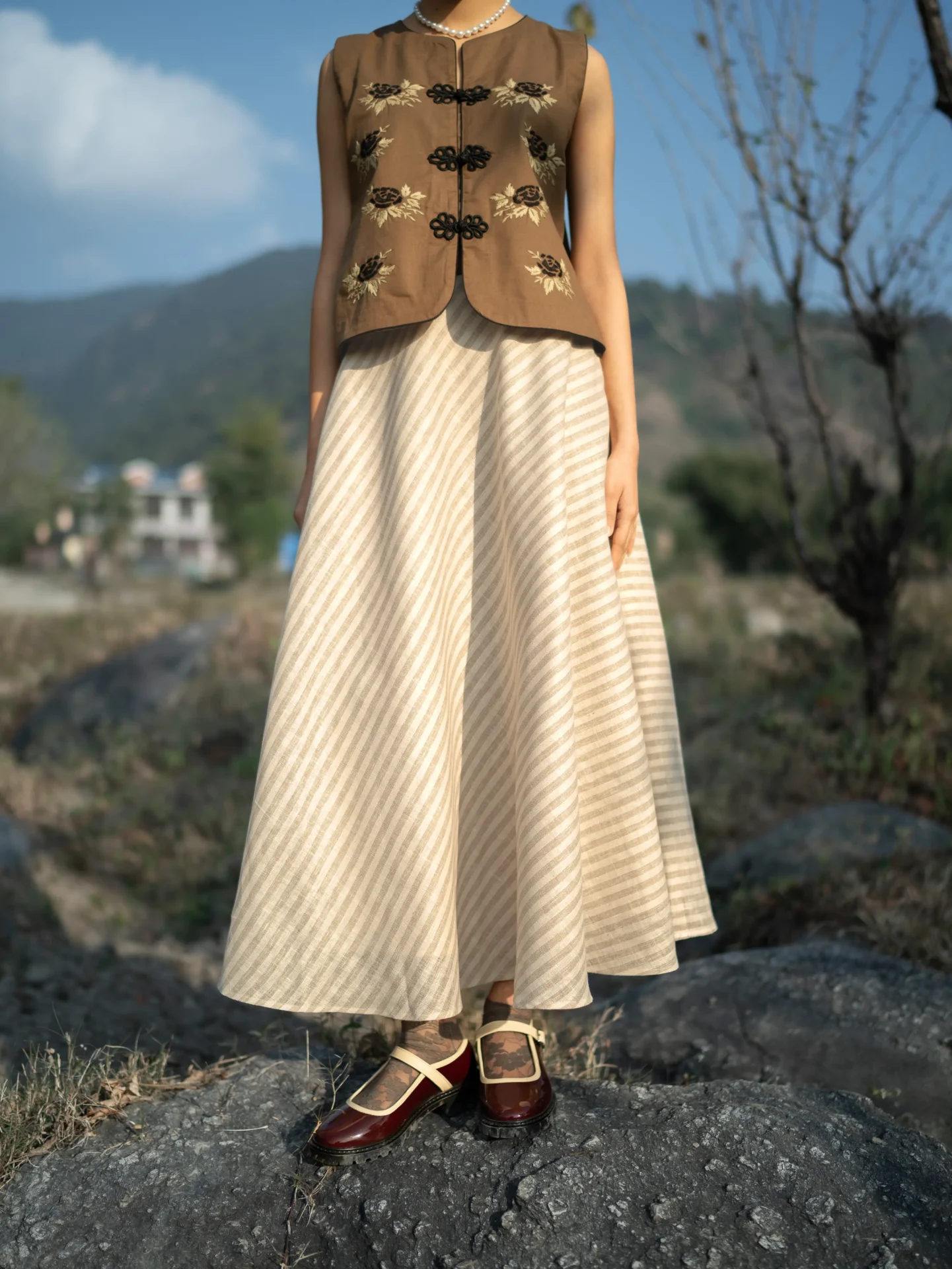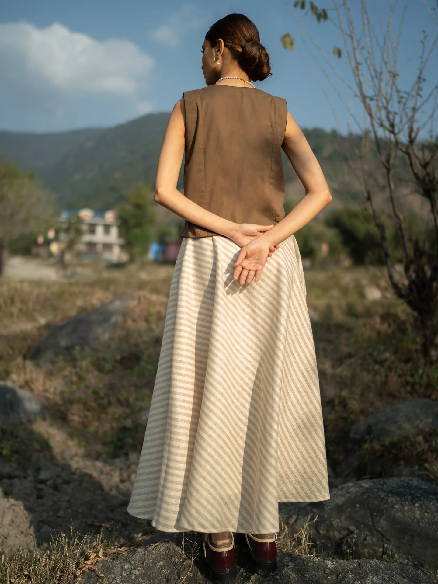 Featuring a stripes print, featuring clean waistband keeps the look sleek and structured, it has side zip opening to ensure a comfortable, flexible fit that moves effortlessly with you. It has cotton lining attached. The gentle flare adds fluidity to every step—making it a perfect choice for both casual and dressed-up edits.