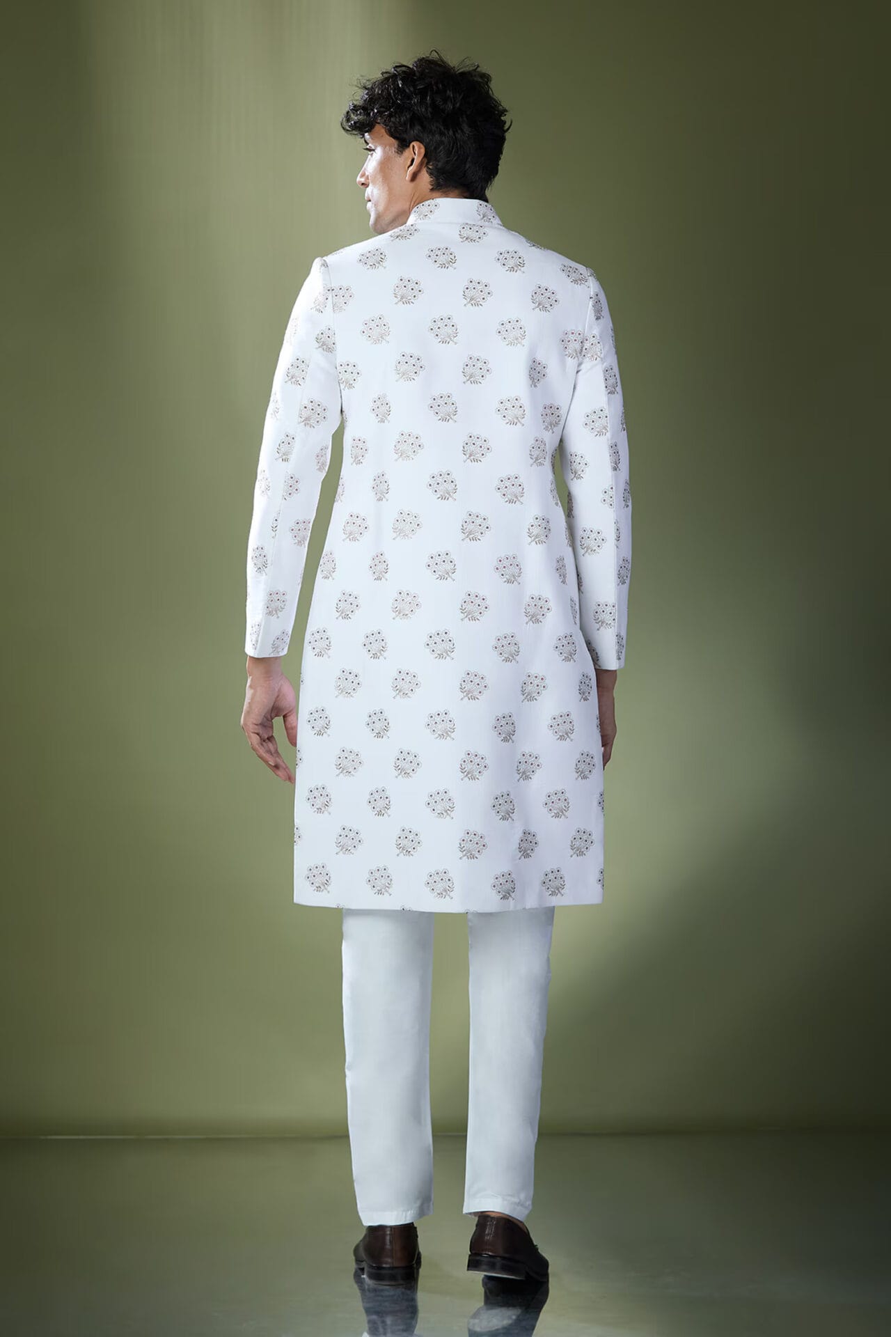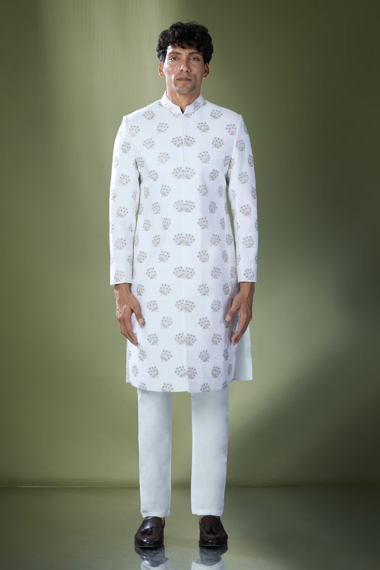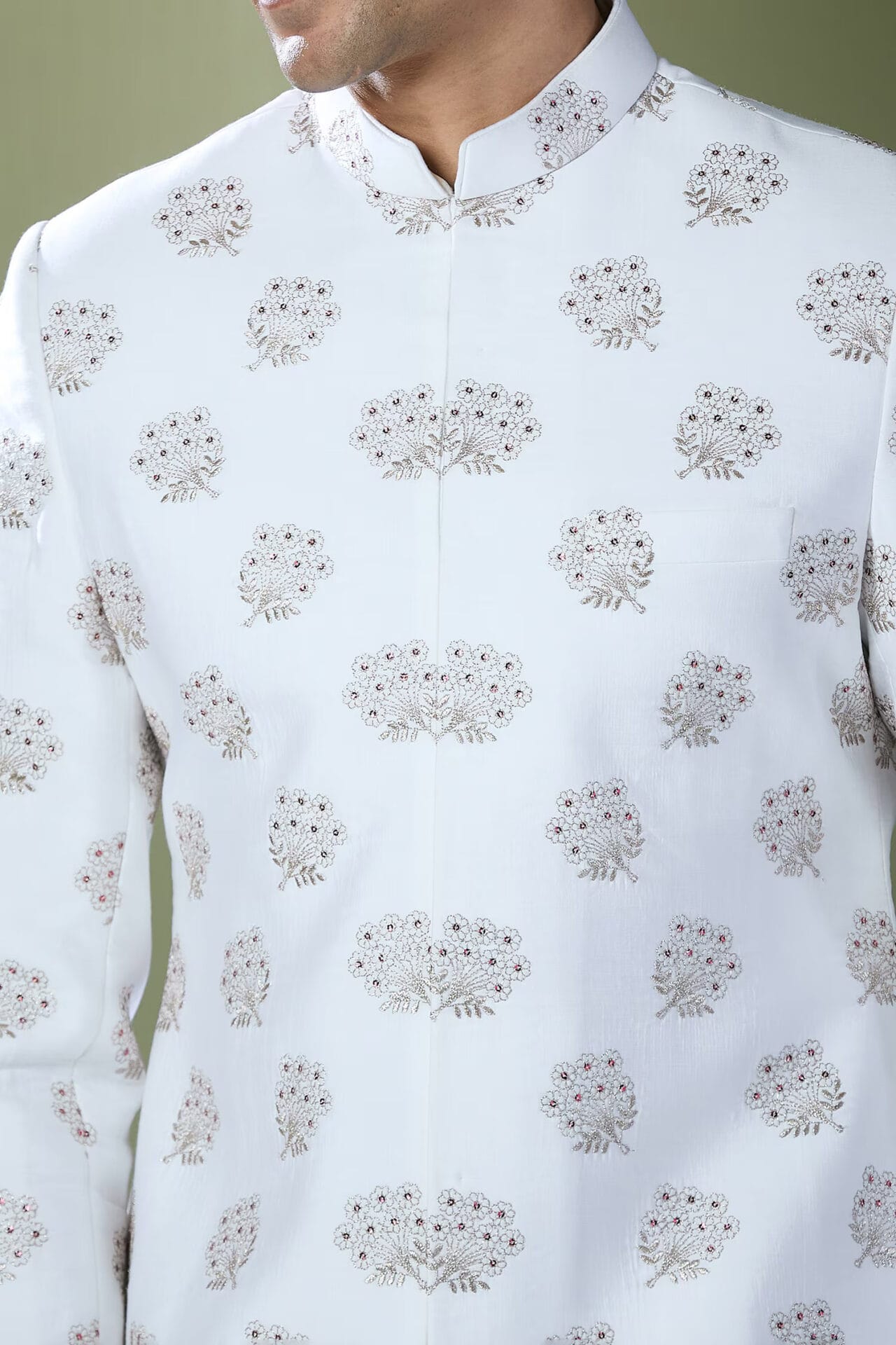 Off White raw silk based achkan enhanced with zari and stone floral motifs, paired with an off white dupion silk based pants