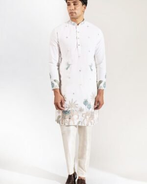 Off White crepe silk based kurta enhanced with resham, cutdana and beads embroidery and embroidered motifs paired with an off white dupion silk based pants.