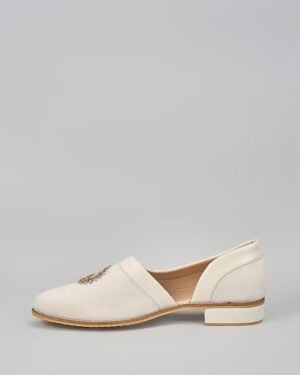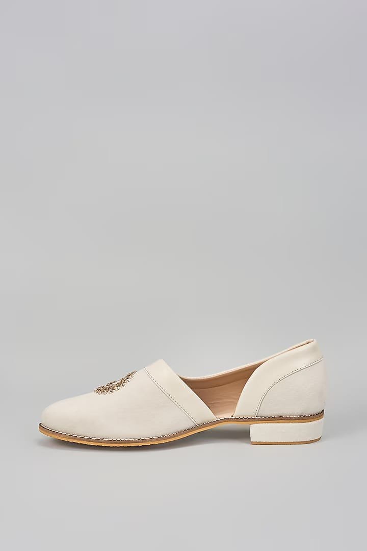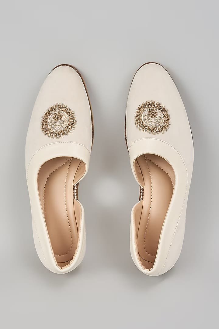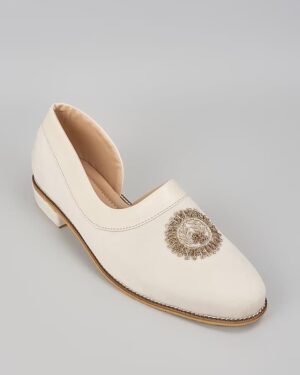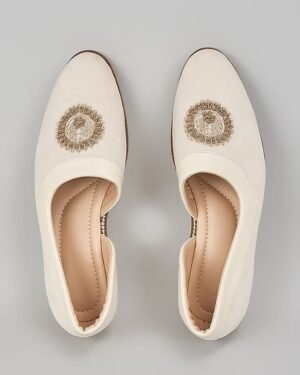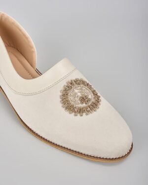 A pair of off white suede based slip on peshawaris enhanced with hand embroidered royal crest. It has a padded leather lining and a hard sheeted rubber sole.