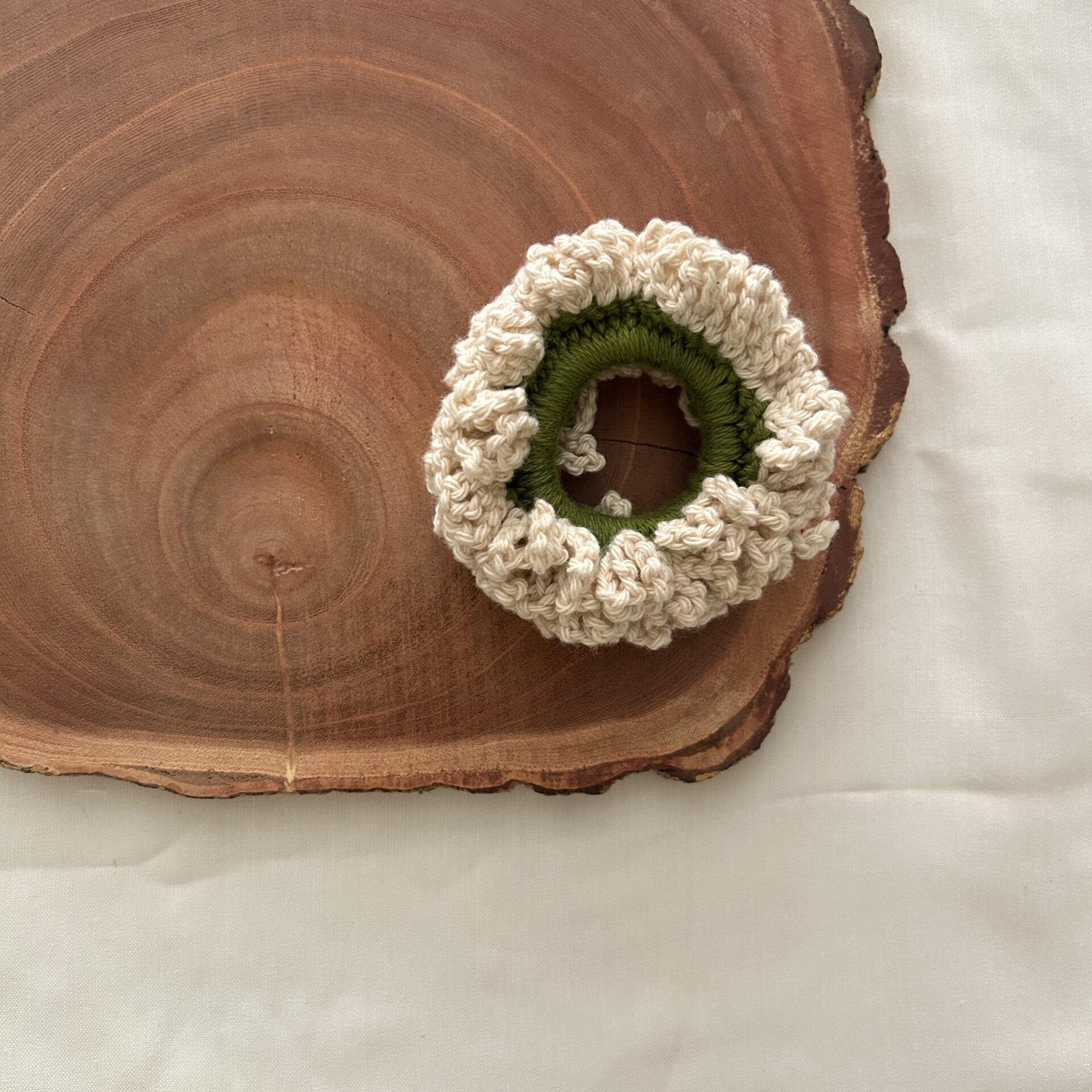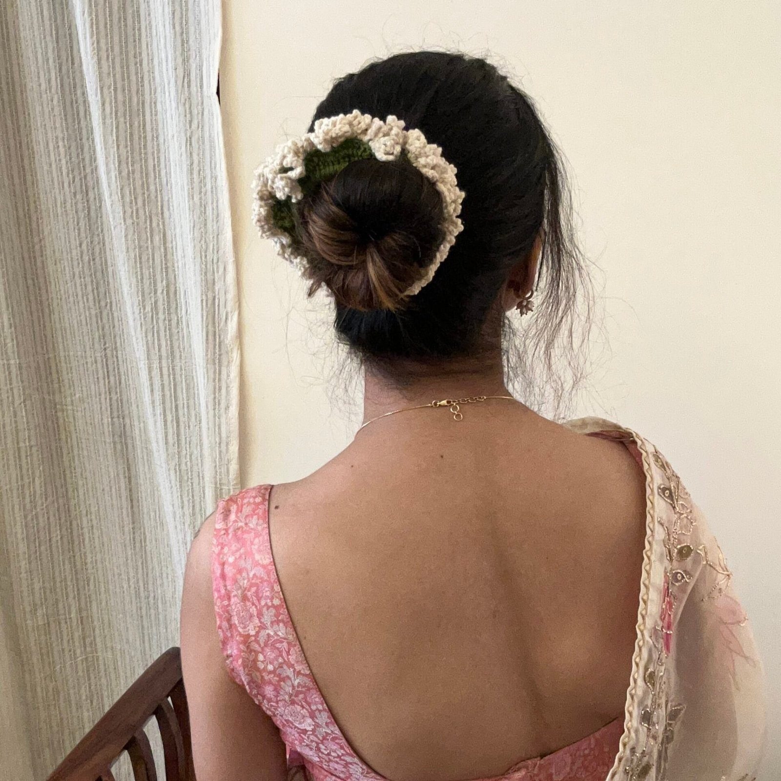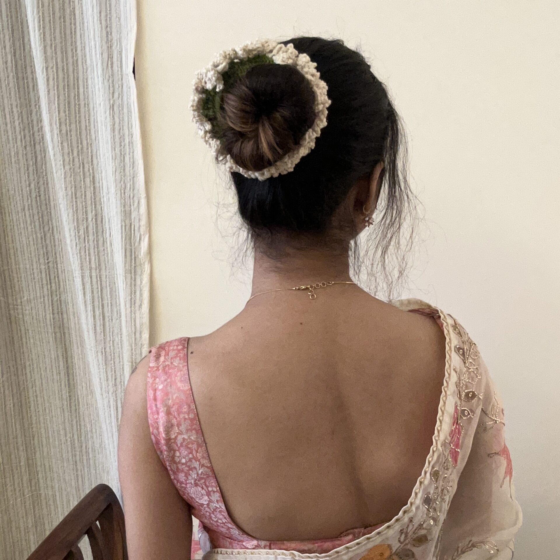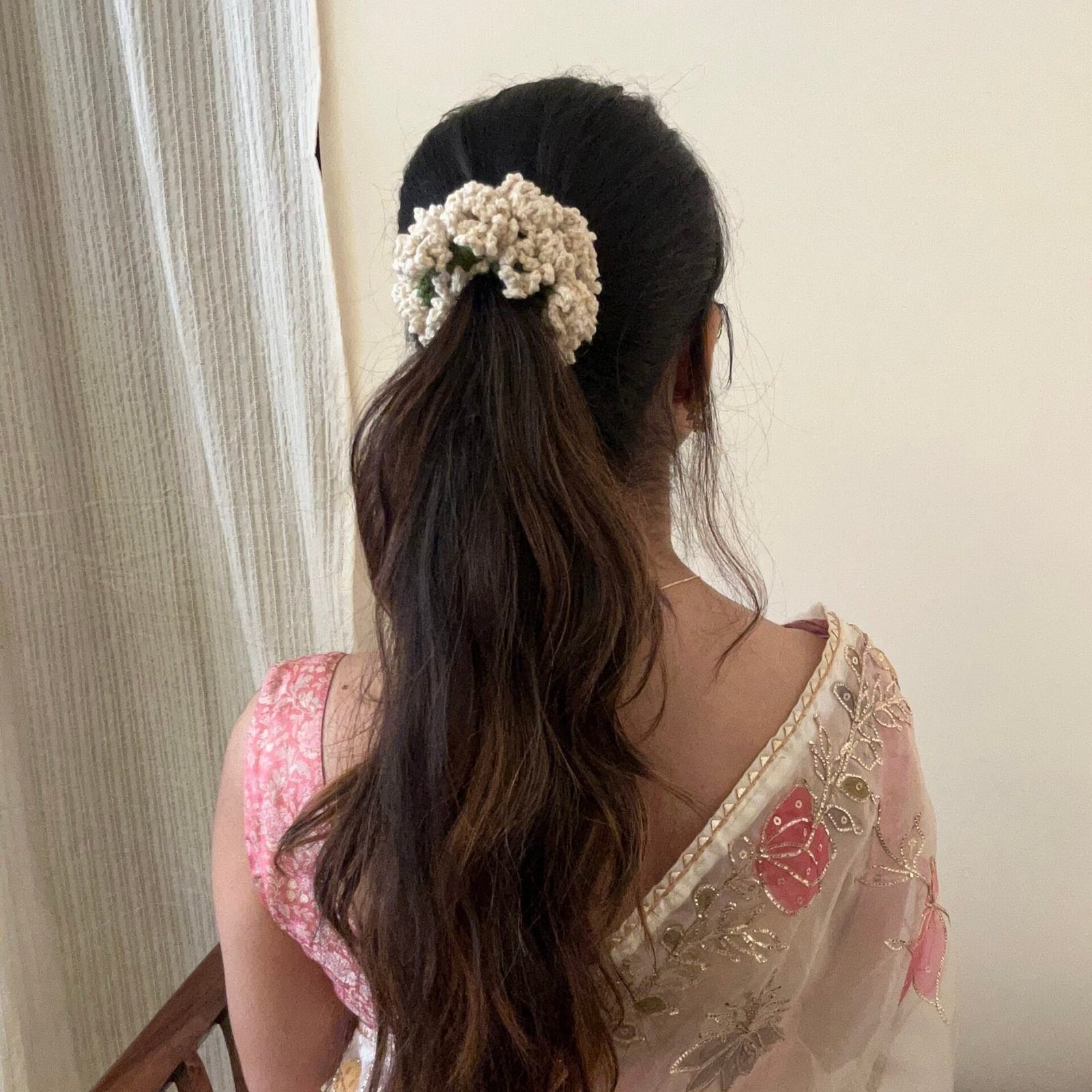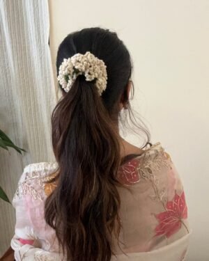 A delicate hand-crocheted off-white scrunchie inspired by the elegance of traditional flower gajras?subtle, timeless, and rooted in nostalgia.