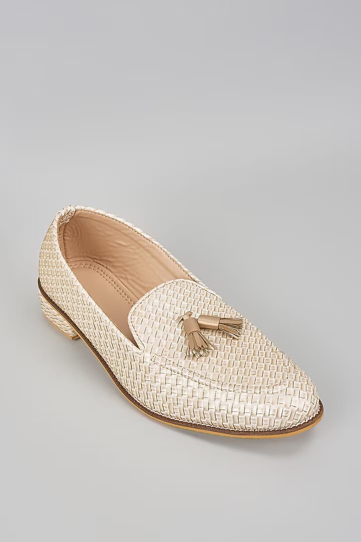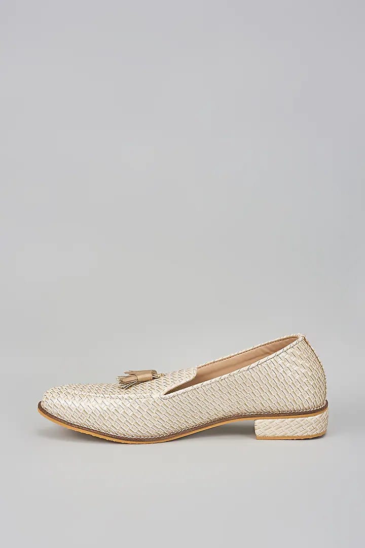A pair of off white full grain leather based handcrafted shoes, enhanced with tassel detail. It has a padded leather lining and a hard sheeted rubber sole.