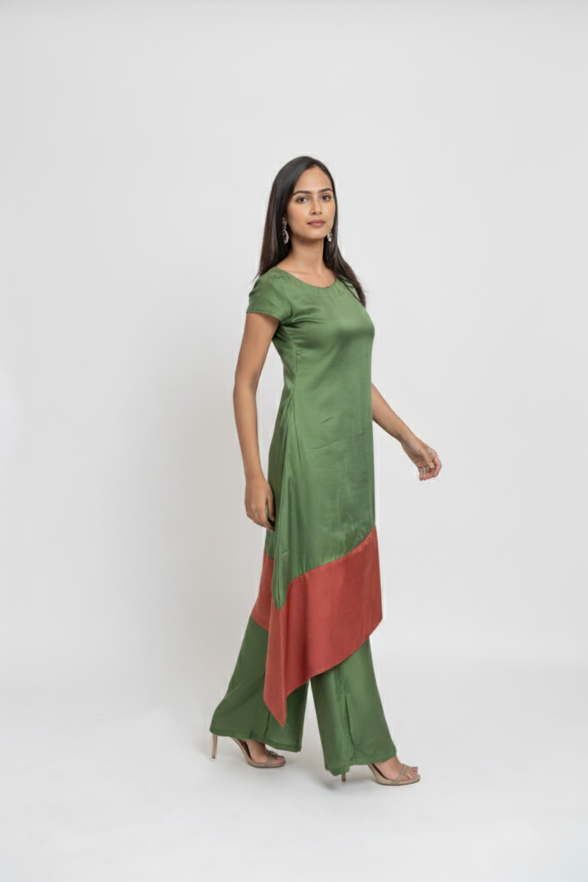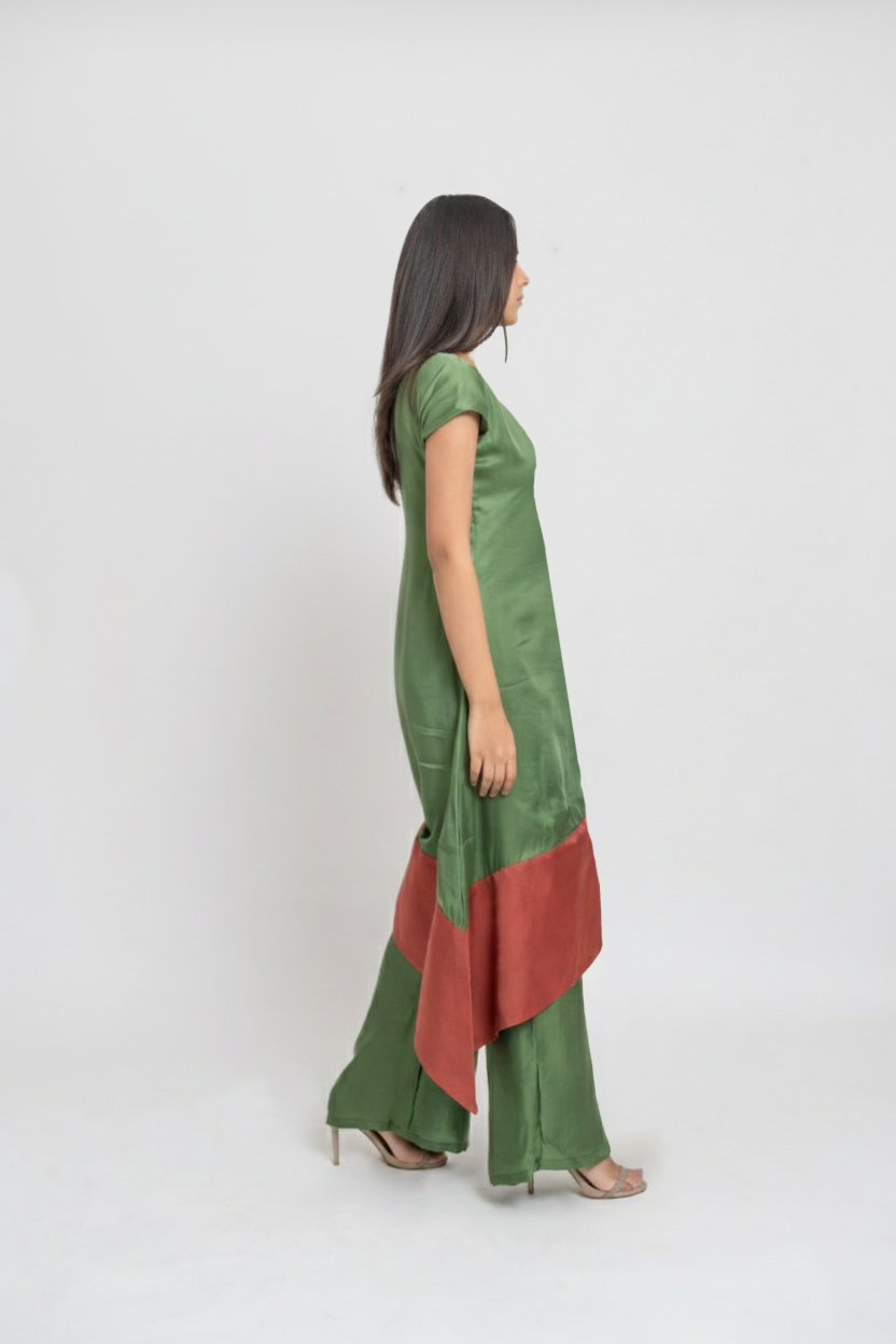 The Olive Green and Crimson Asymmetrical Kurta exude contemporary charm with its unique color combination and asymmetric design. Featuring chic cap sleeves and a fluid silhouette, it pairs seamlessly with the wide-legged Olive Pants for a sophisticated ensemble. Perfect for both formal and casual settings, this outfit combines elegance with modern flair, ensuring a standout presence with its versatile and stylish appeal.