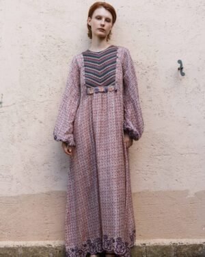 A beautifully detailed Onion pink printed maxi with embroidered yoke and schfflie hemline that reflects Pinnacle by Shruti Sancheti?s artisanal precision and timeless design language.