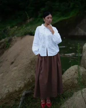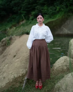 Paired with a rich mocha brown skirt, it creates a striking co-ord, with pleats and lace detailing all done by human hands which makes its a timeless choice for everything from casual gatherings to refined occasions