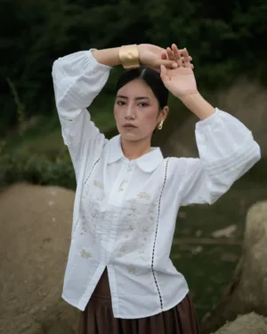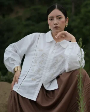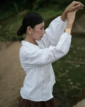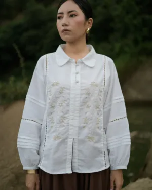 In crisp white cotton-linen, this top features a charming Peter Pan collar trimmed with lace and delicate hand embroidery at the front. Pleated lace detailing on the sleeves adds a vintage touch. Pair it effortlessly with a neutral or striking skirt for a timeless look.