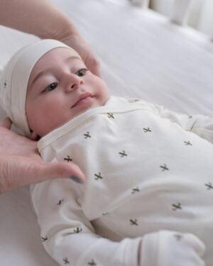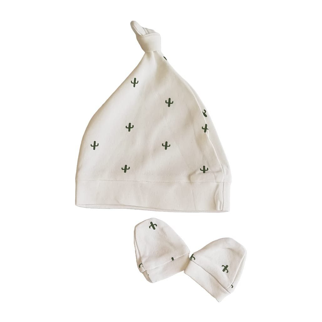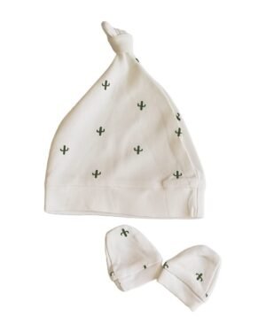 • 100% certified organic cotton.• Natural dyed soft cotton.• Pack of knotted hat and mittens• Knotted top that can be adjusted to fit.• Finger safe design on our mittens to prevent loose threads from wrapping round tiny fingers.
