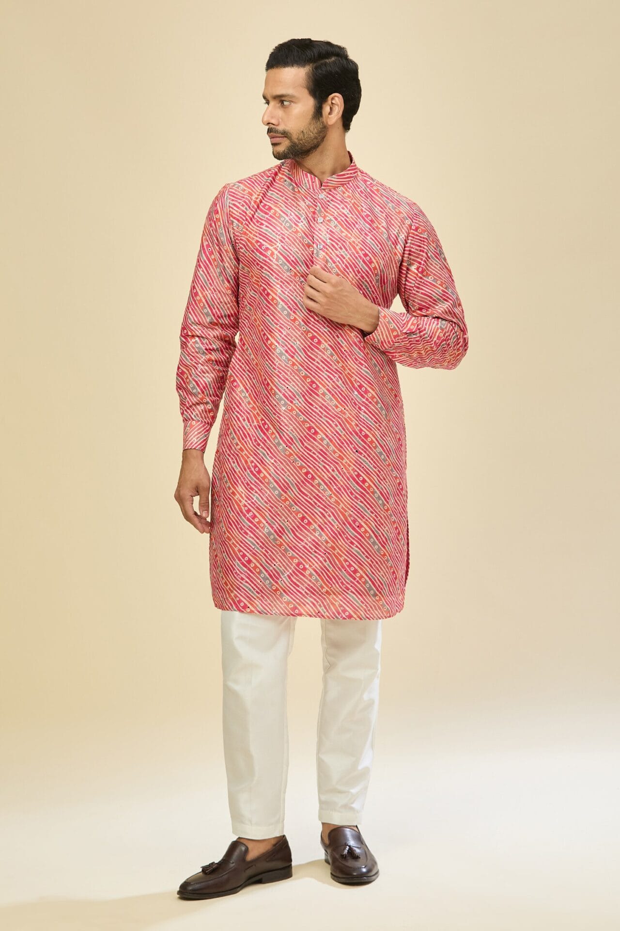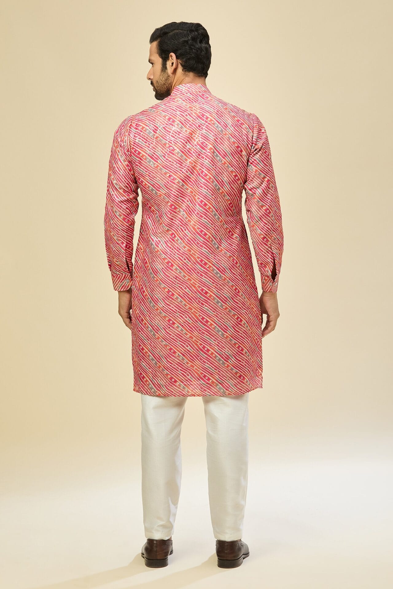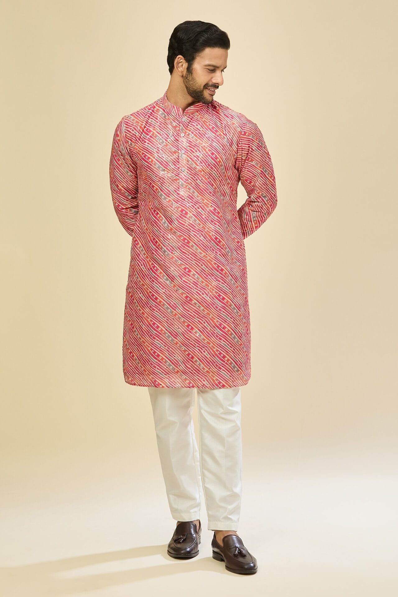 Pink cotton silk based leheriya print kurta enhanced with sequins, paired with an off white dupion silk based mexican pants.