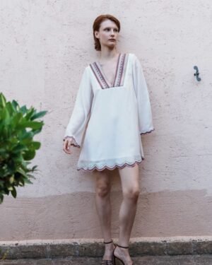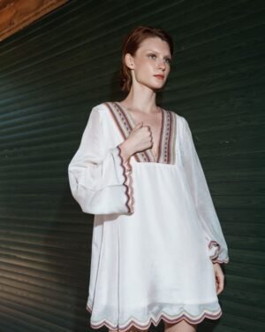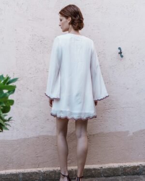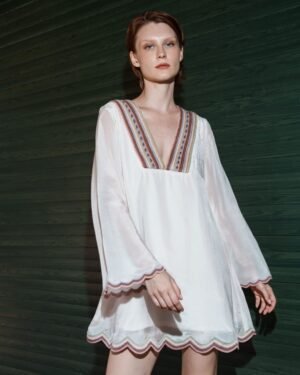 Crafted in fine fabric, this Pink mul embroidered scallop mini dress showcases Pinnacle by Shruti Sancheti?s timeless craftsmanship and feminine grace. A perfect piece for effortless day-to-evening elegance.