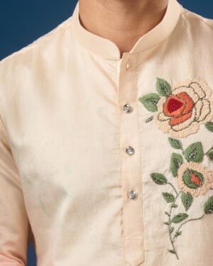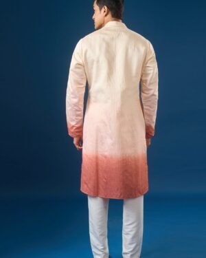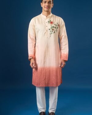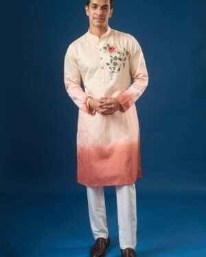 Pink ombre cotton silk based kurta enhanced with resham embroidered motif paired with an off white dupion silk based pants.