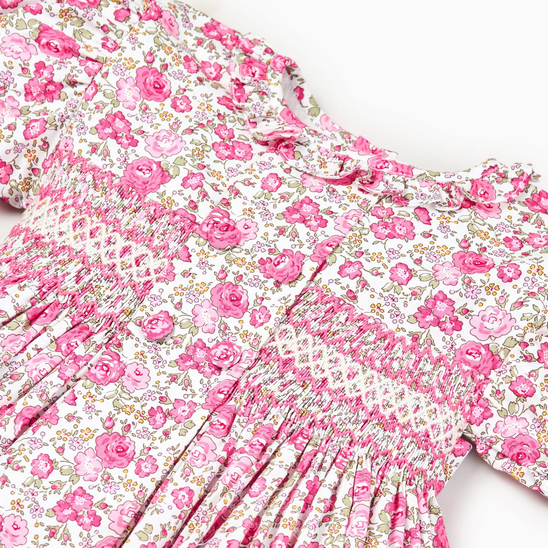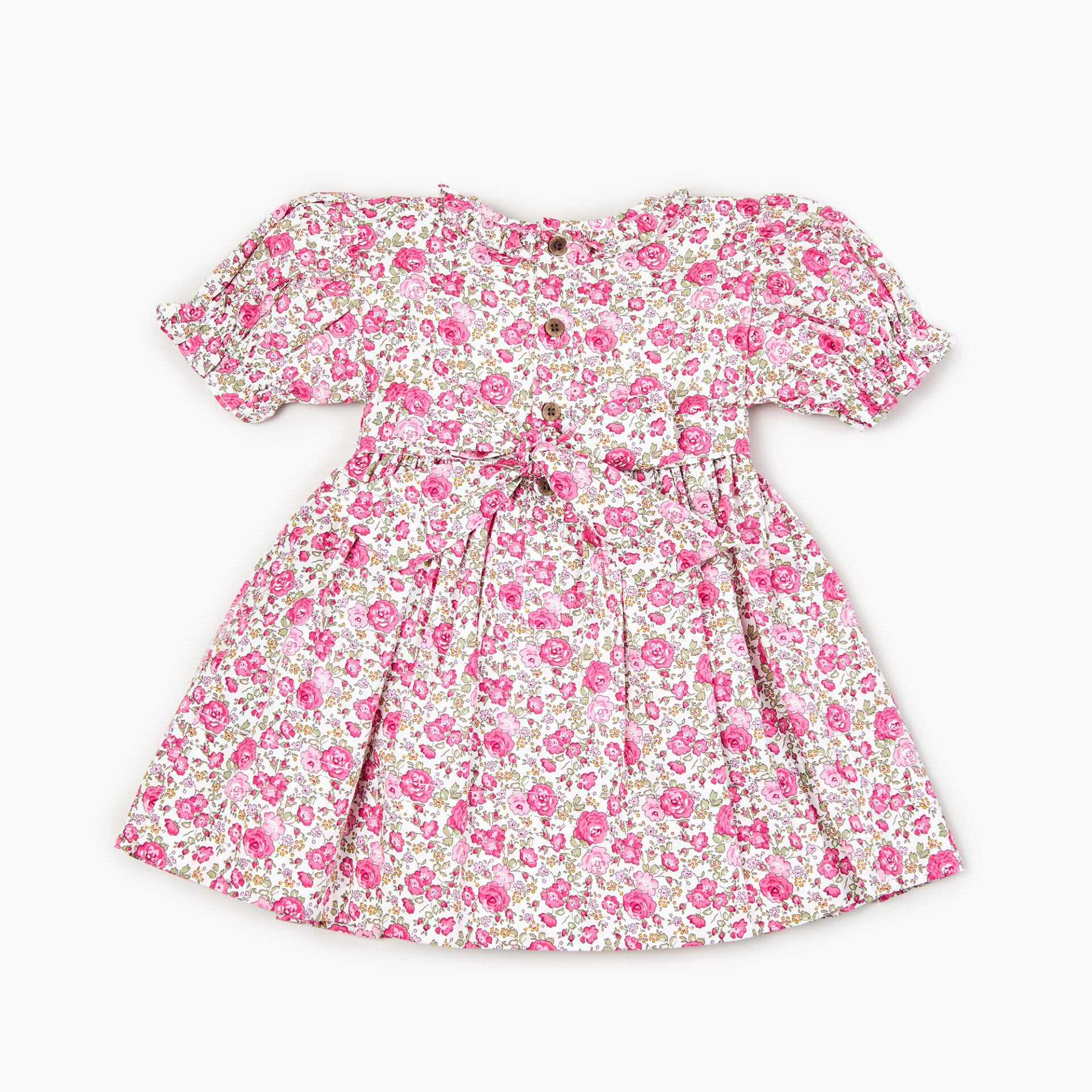 The Pink Roses Hand-Smocked Dress is crafted from soft cotton poplin for lightweight comfort. It features half sleeves, a button-up closure, and a charming printed design accentuated with delicate hand-smocked detailing. A practical front pocket adds functionality, making it perfect for casual spring?summer outings. Hand wash recommended to preserve its quality and vibrant design.