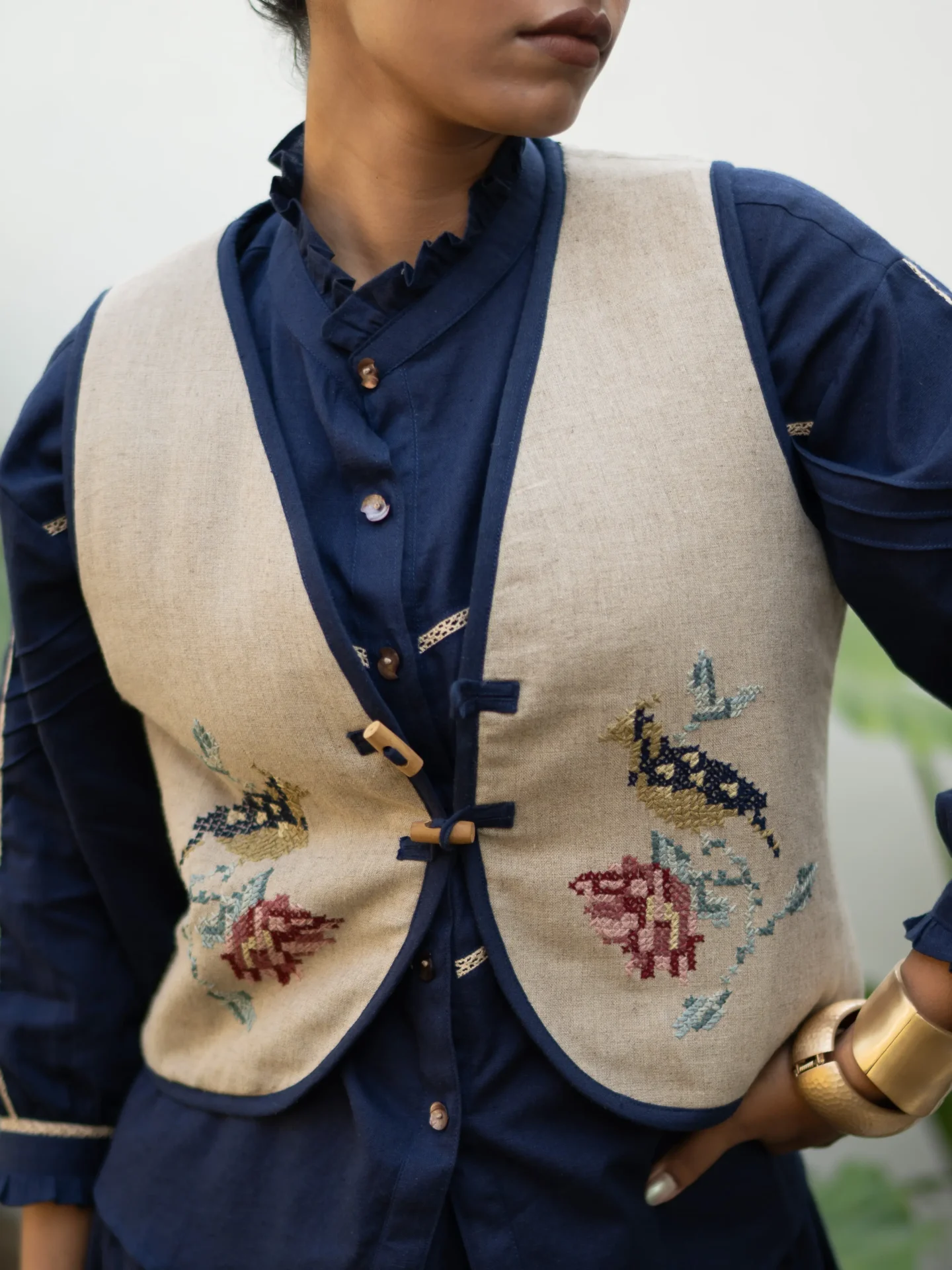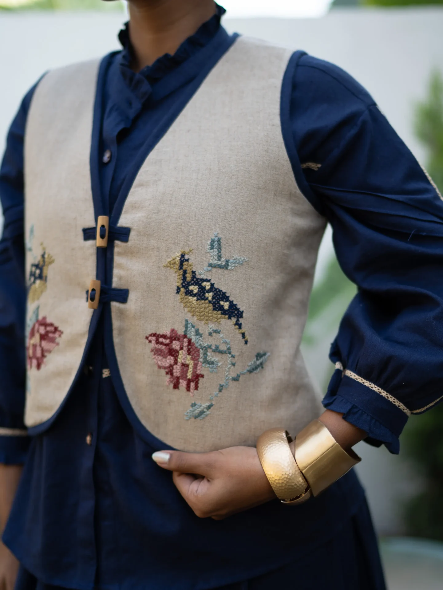 Made from breathable, premium linen, this silhouette is elevated with intricate cross-stitch hand embroidery, each motif patiently created by skilled artisans. The vest features a clean, structured cut that layers beautifully over dresses or separates, making it a versatile statement piece for work, travel, or weekend styling